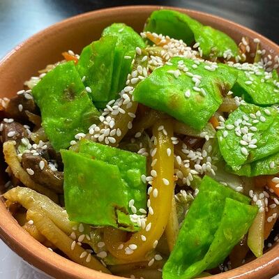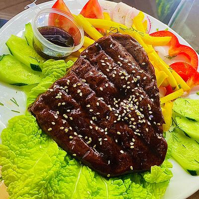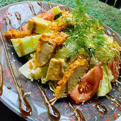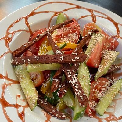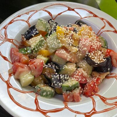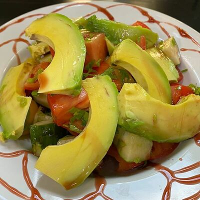 Свежие огурцы, помидор, болгарский перец, заправка (лимонный соус, гранатовый соус), авокадо