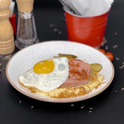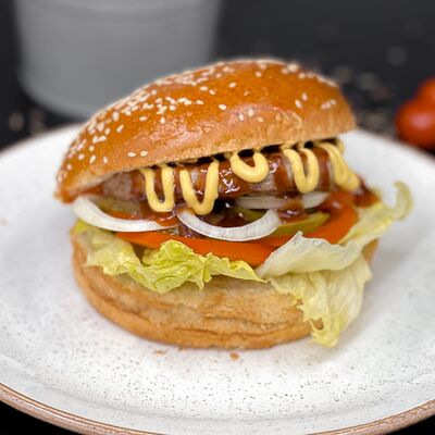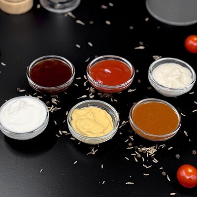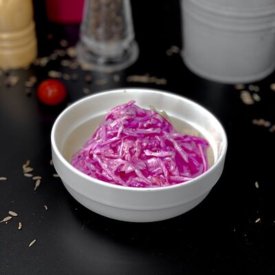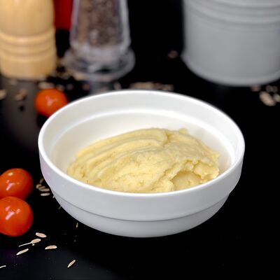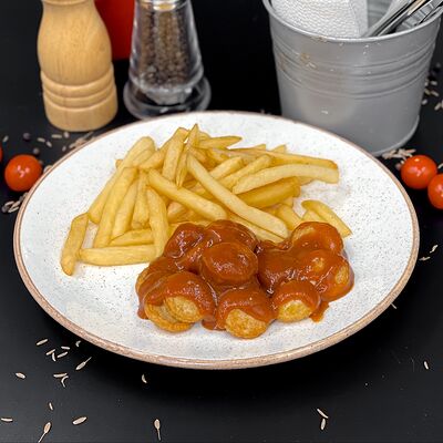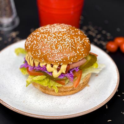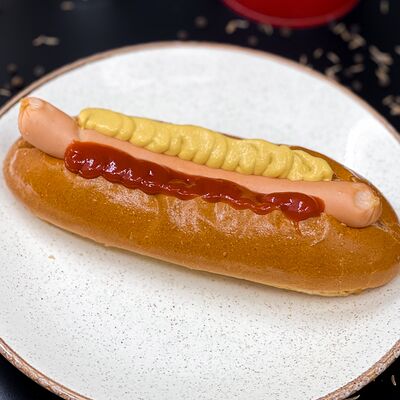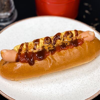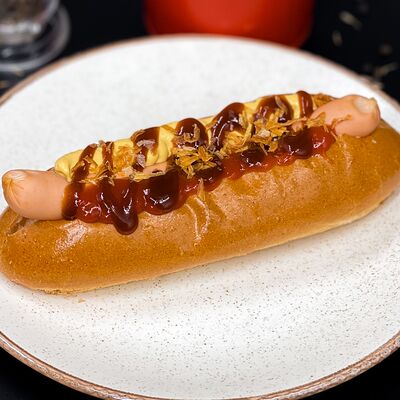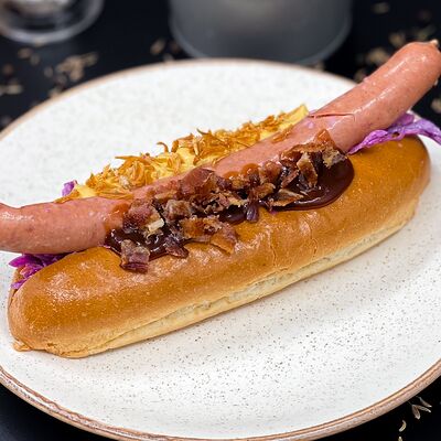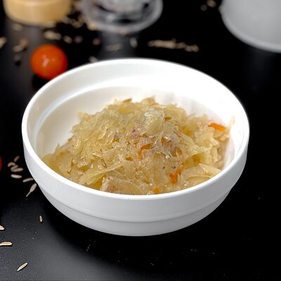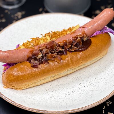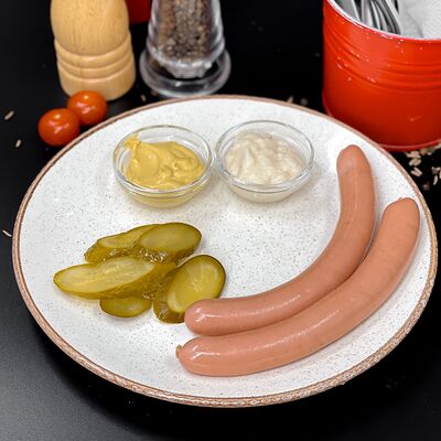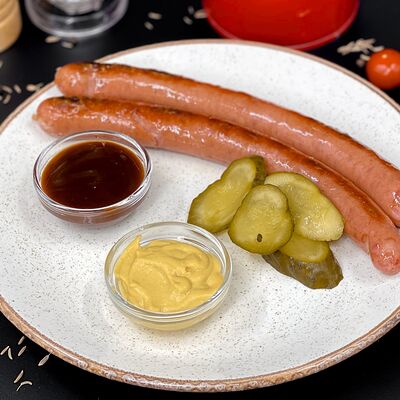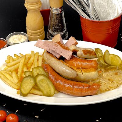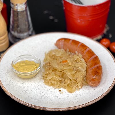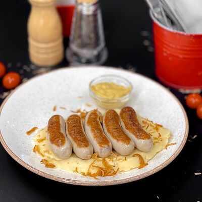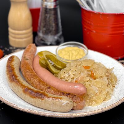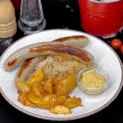 Cвинo-говяжьи белые колбаски, подаются с капустой по-баварски (капуста квашенная, лук репчатый, масло сливочное, чеснок, картофель), картофелем айдахо и горчицей
