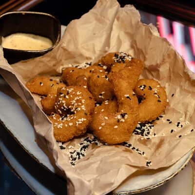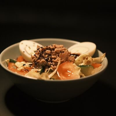 Тунец консервированный, огурец, яйцо, салат Айсберг, соус Цезарь, шрирача, паста из маслин, хлеб
