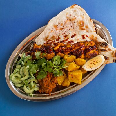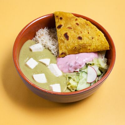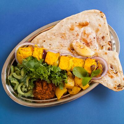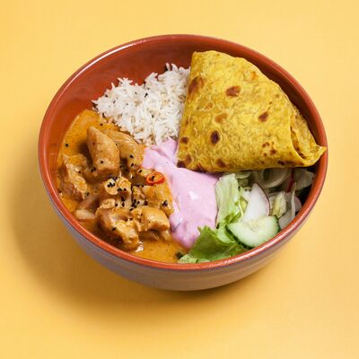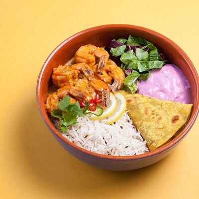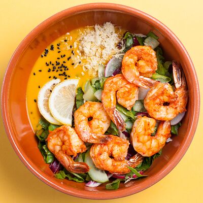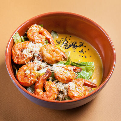 Жареные тигровые креветки с салатом айсберг, свежим редисом, огурцами и соусом из манго и кокосового молока (7 шт.)