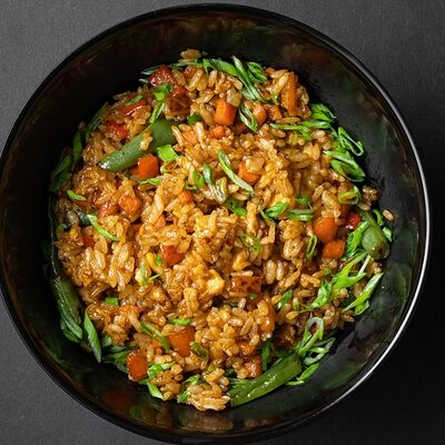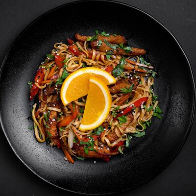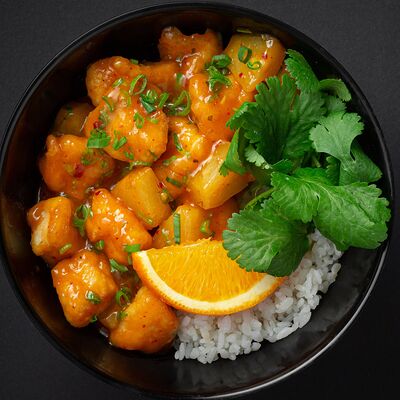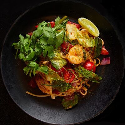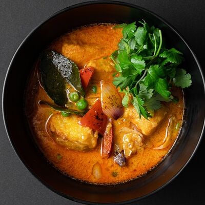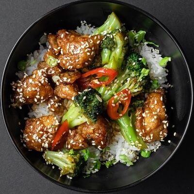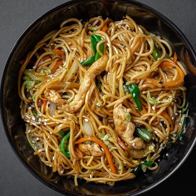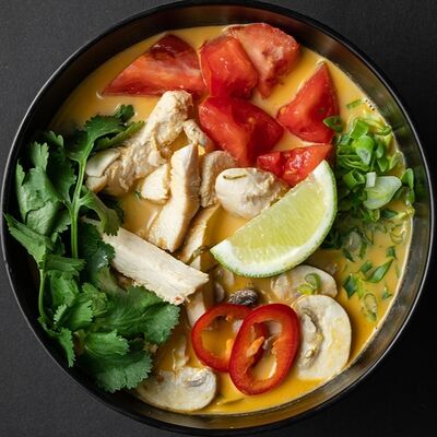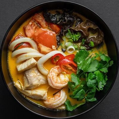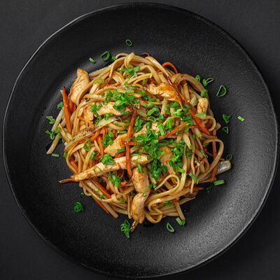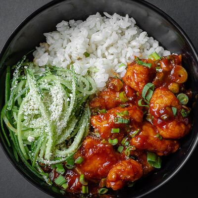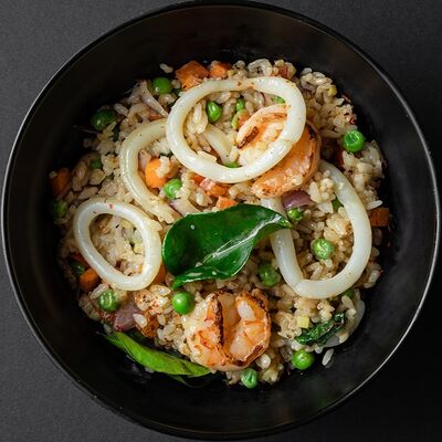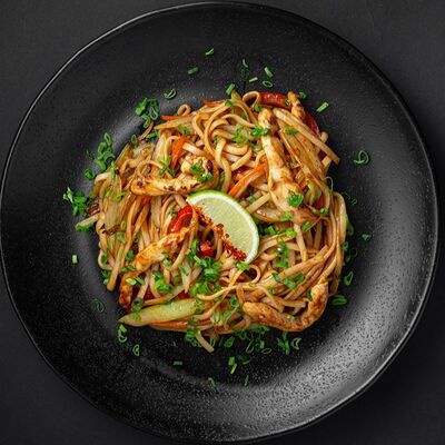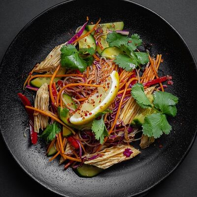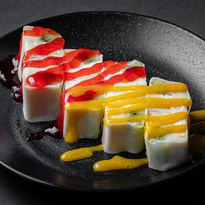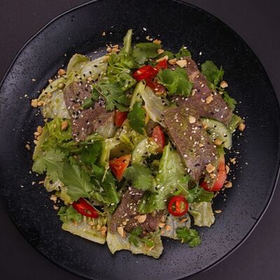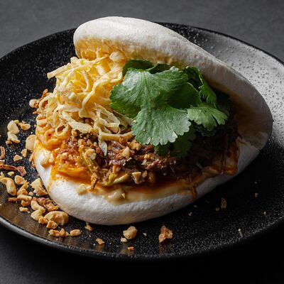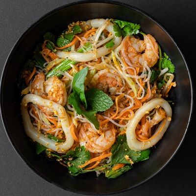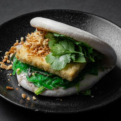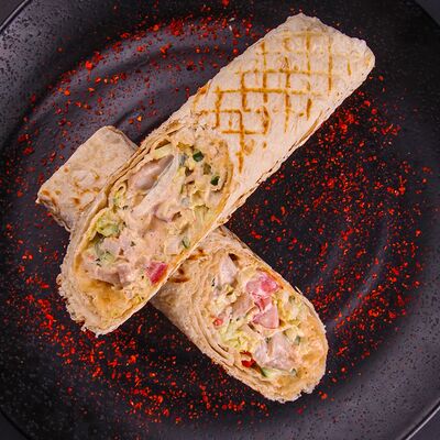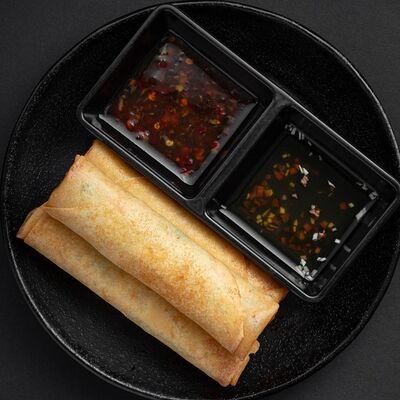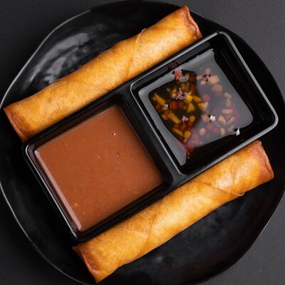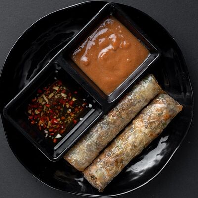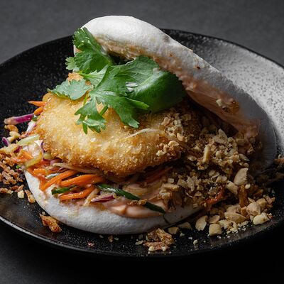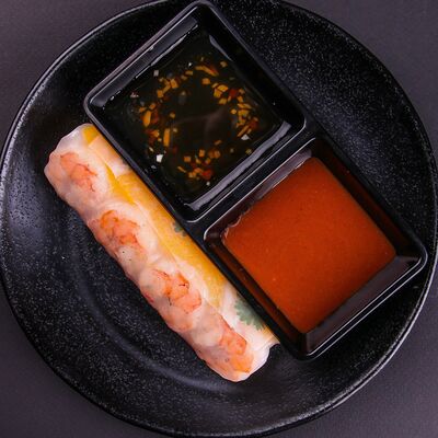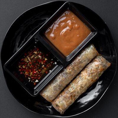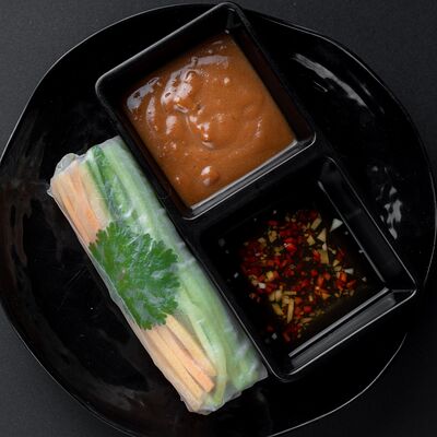 Пшеничная мука, молоко, крахмал, разрыхлитель, дрожжи, соль, куриная грудка, панировочные сухари, овощи маринованные (морковь, огурец, дайкон, чеснок, соевый соус темный, чили дробленый, уксус рисовый), жареный арахис, жареный лук, майонез, шрирача, кинза