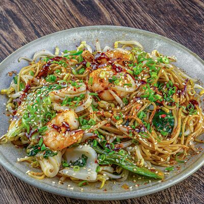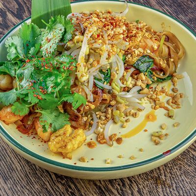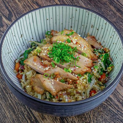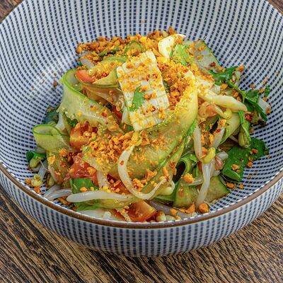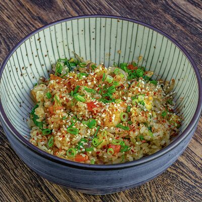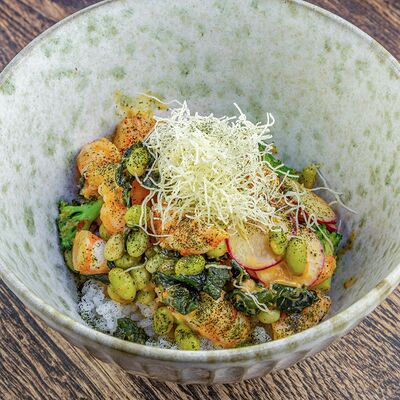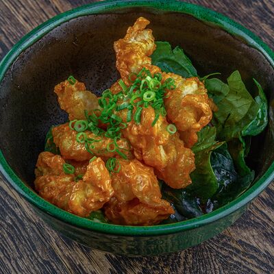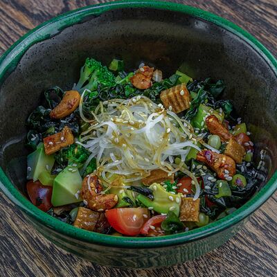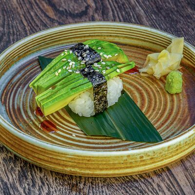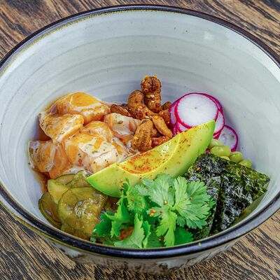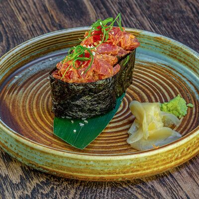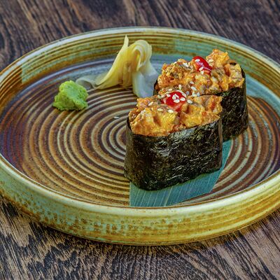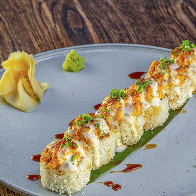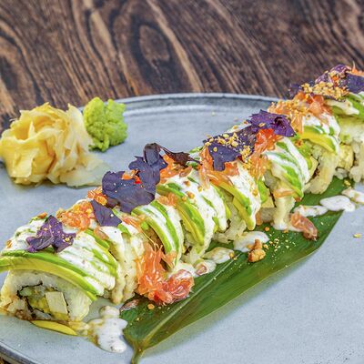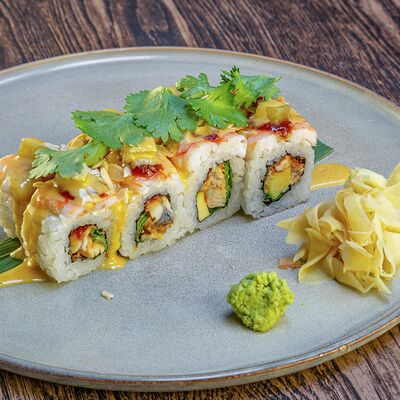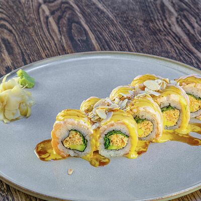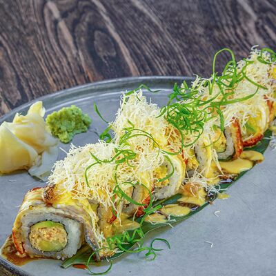 Рис, нори, авокадо, свежий огурец, салат айсберг, тунец, соус чимичурри, соус халапеньо, катаифи