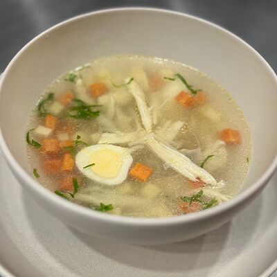 Куриный бульон, курица, вермишель, морковь, корень сельдерея, перепелиное яйцо