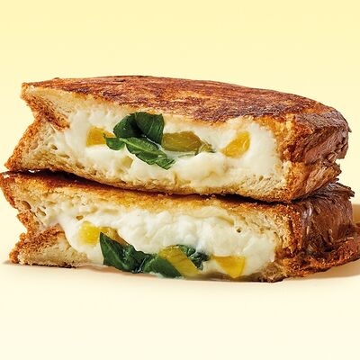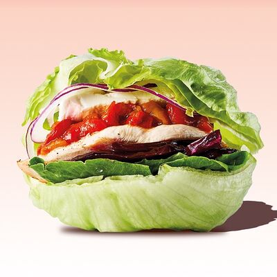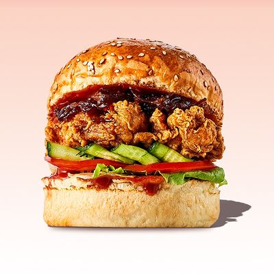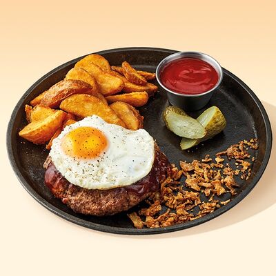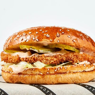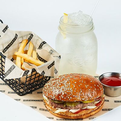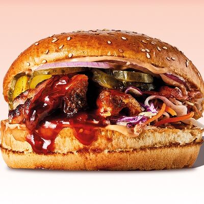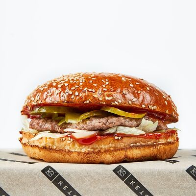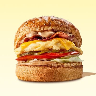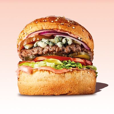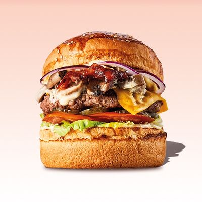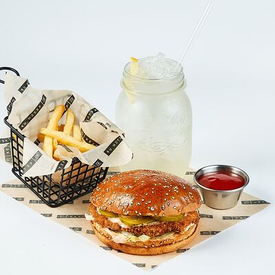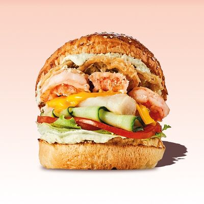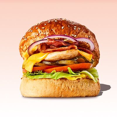 Булочка, майонез, котлета из говядины, пармезан, айсберг, помидор, маринованный огурец, лук, соус чили-лайм, ананас гриль
