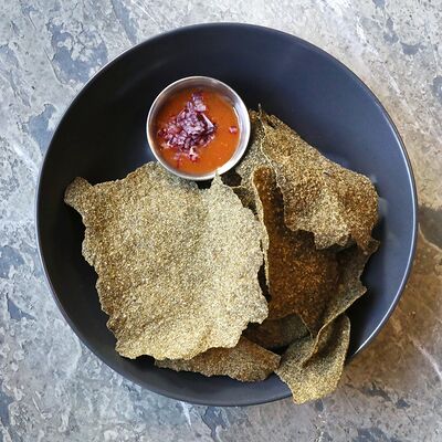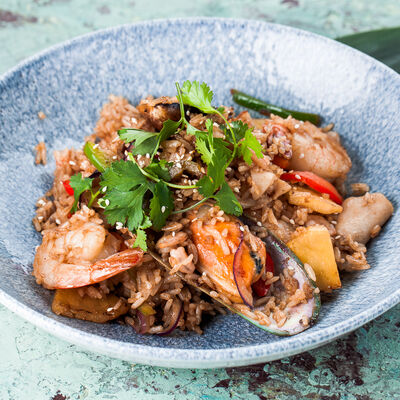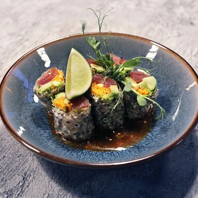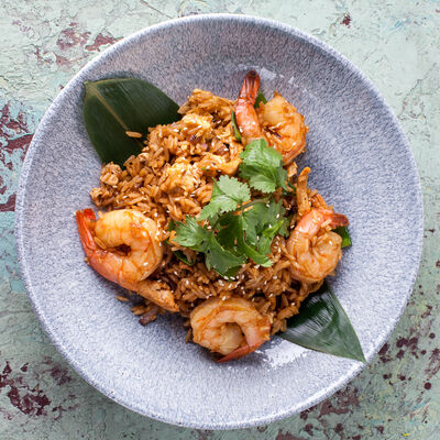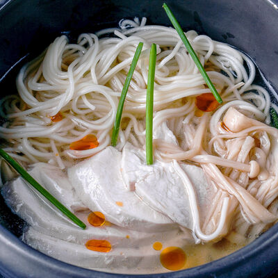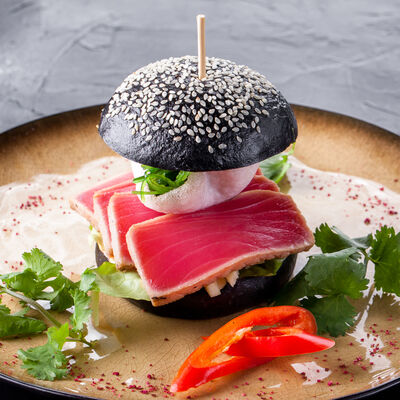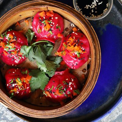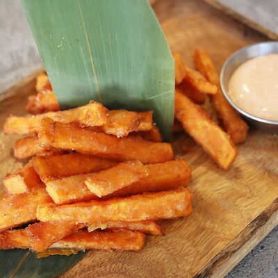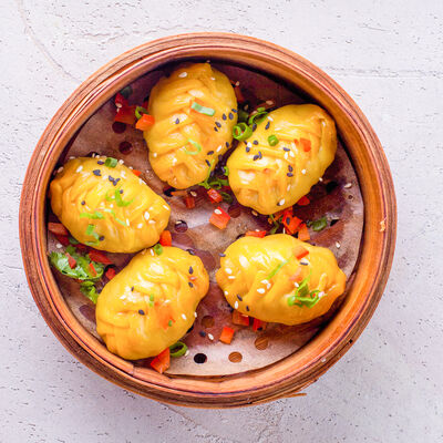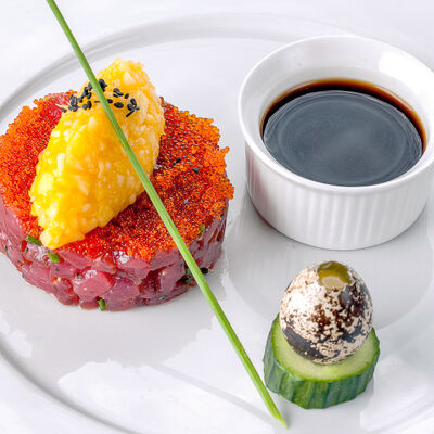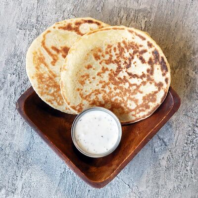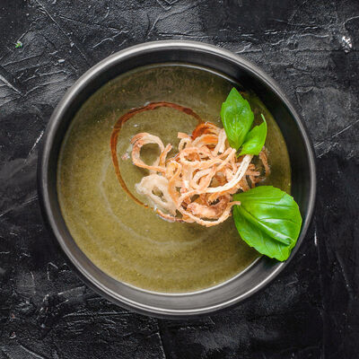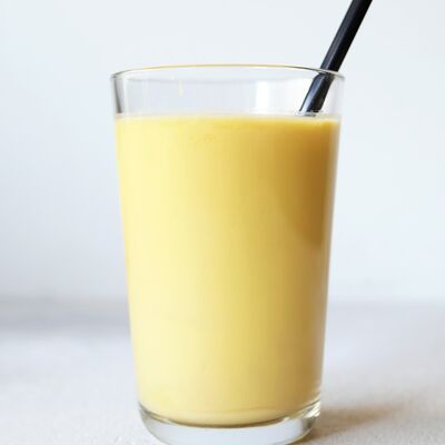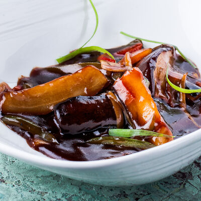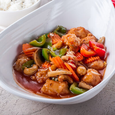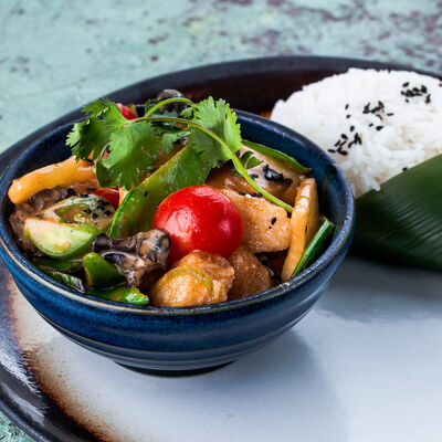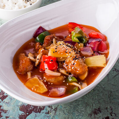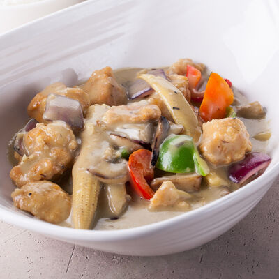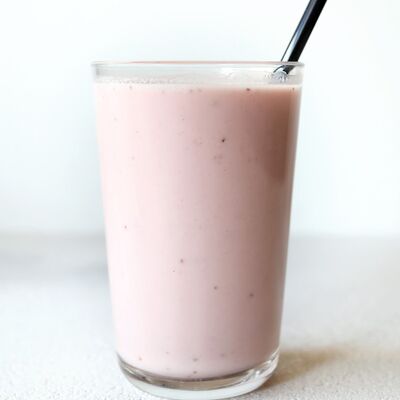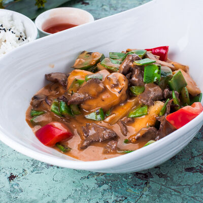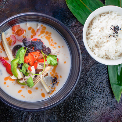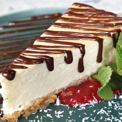 Готовится из кокосовых сливок. Подается с клубничным соусом