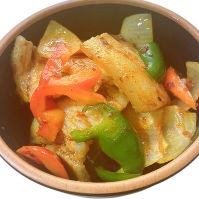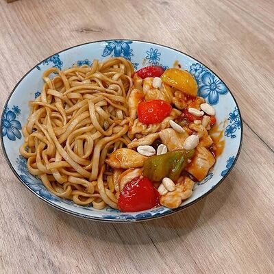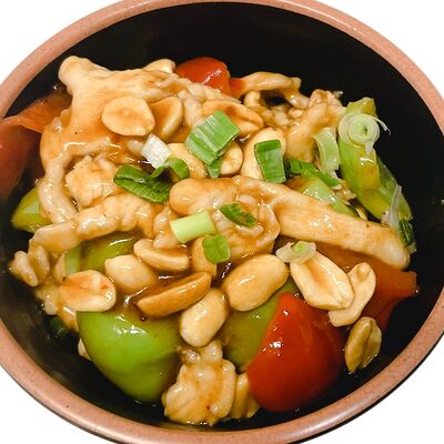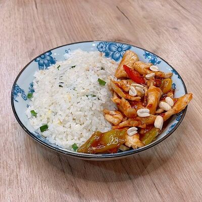 Филе цыпленка, рис на пару, болгарский перец, арахис, кисло-острый соус гунбао