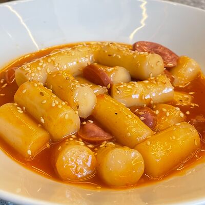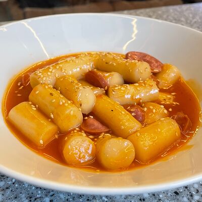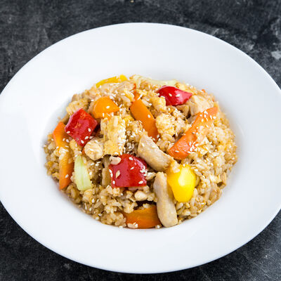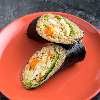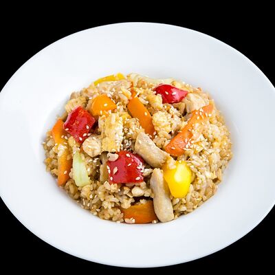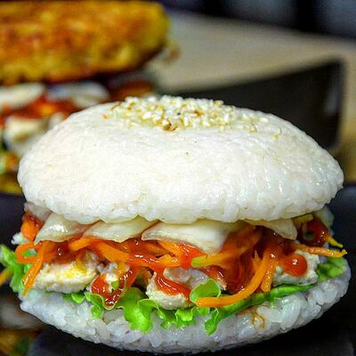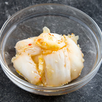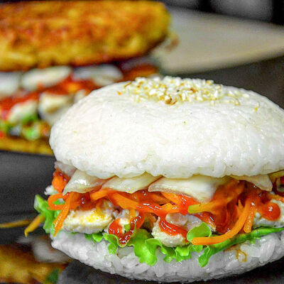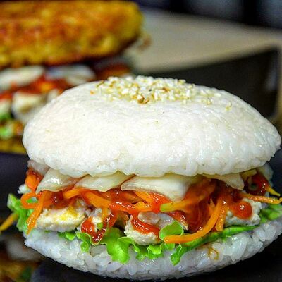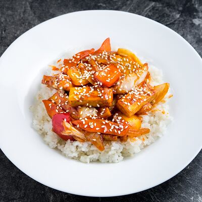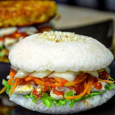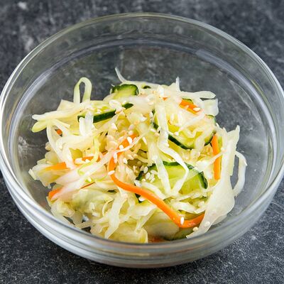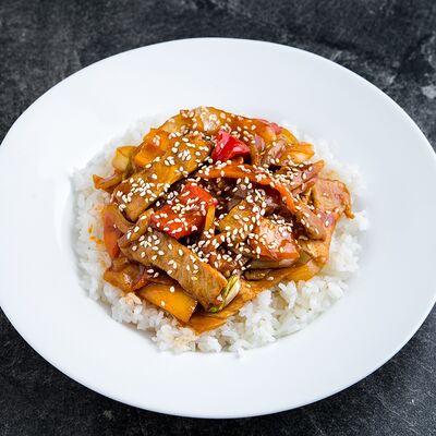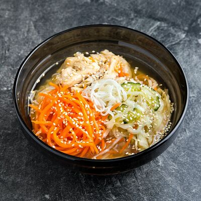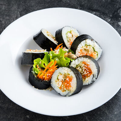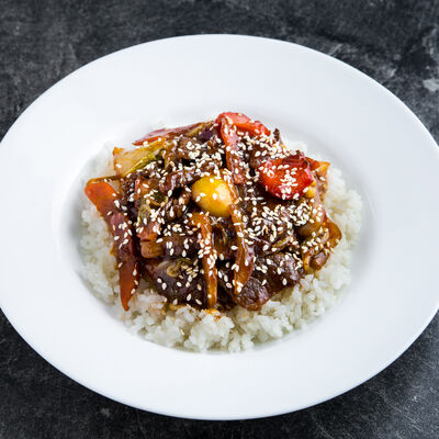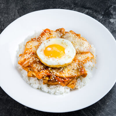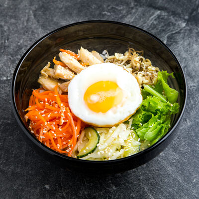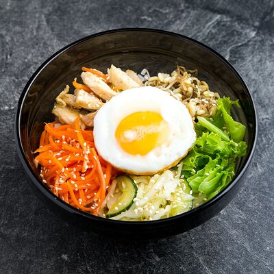 Рис, пять видов корейских салатов, моаморная говядина, перцовая паста, соевый соус, листья салата, яйцо