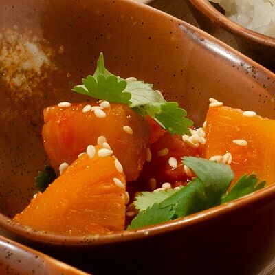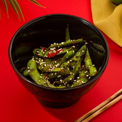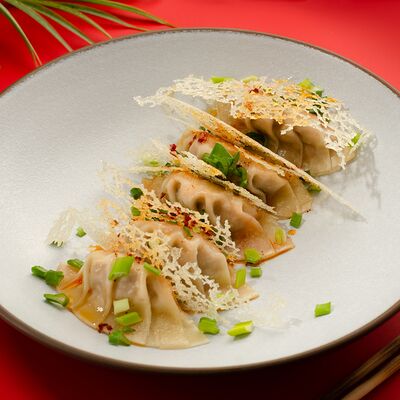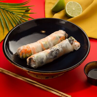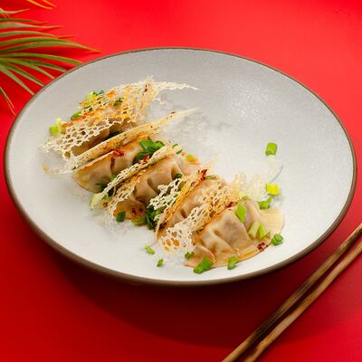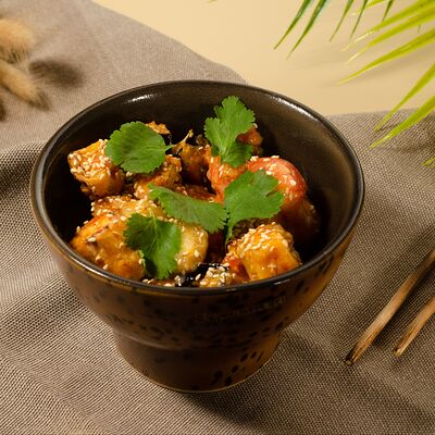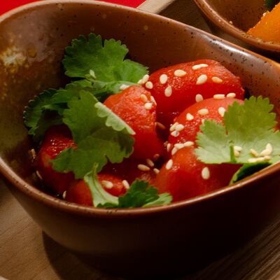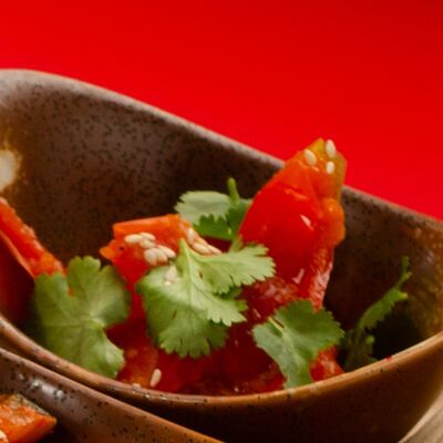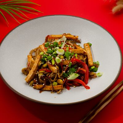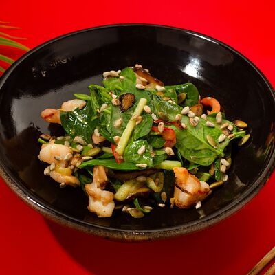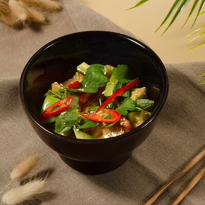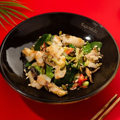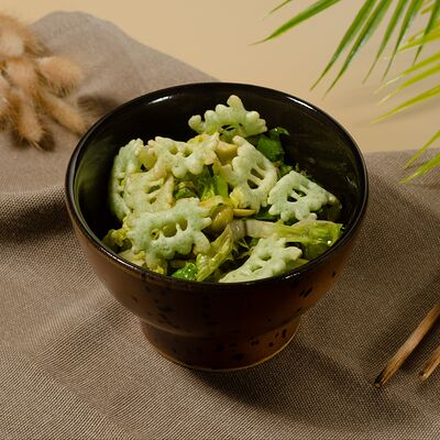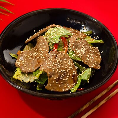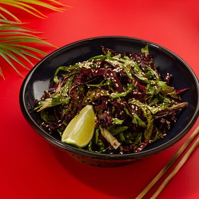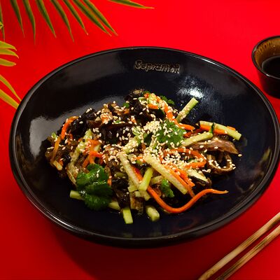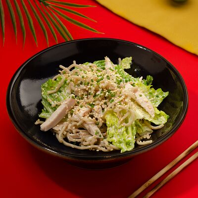 Листья салата ромейн, японский майонез, домашняя лапша, курица су-вид, кунжут, лук-шнитт