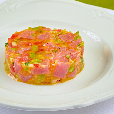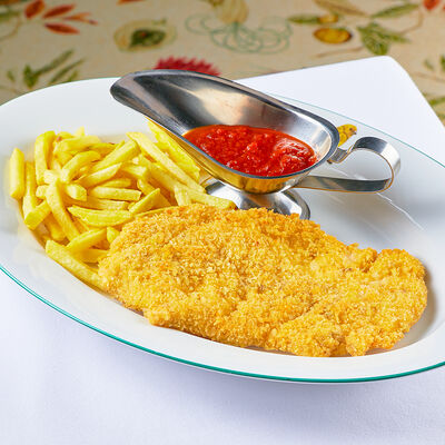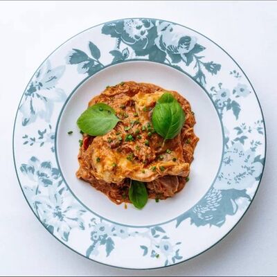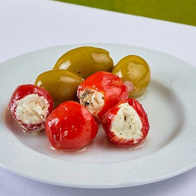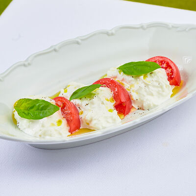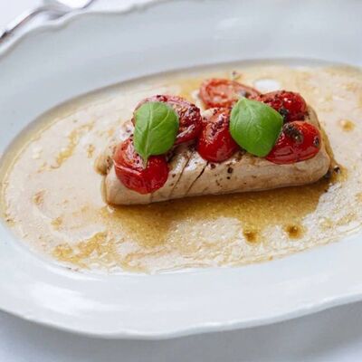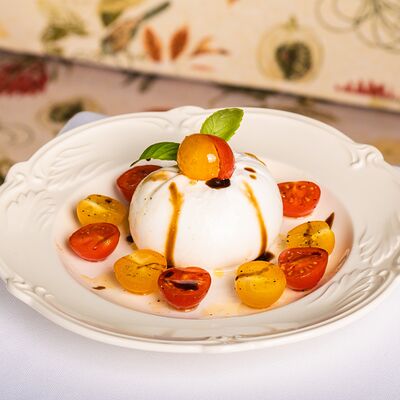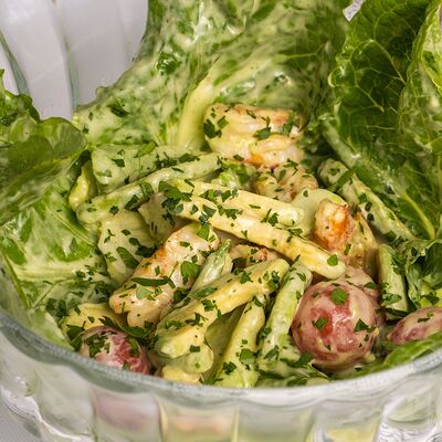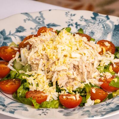 Филе цыпленка разделяем на тонкие волокна, смешиваем с яйцом и домашним майонезом, подаем со свежими томатами черри и салатом