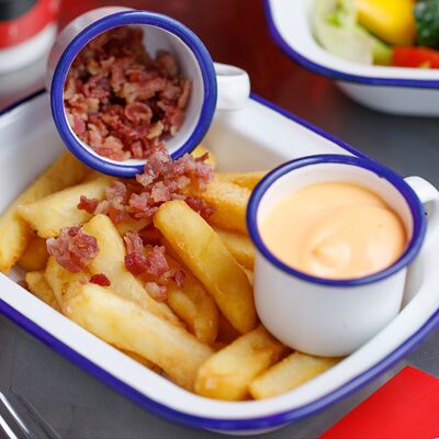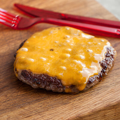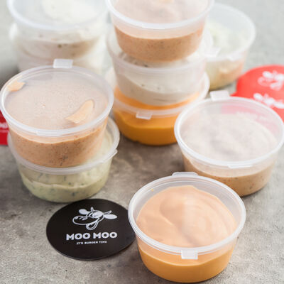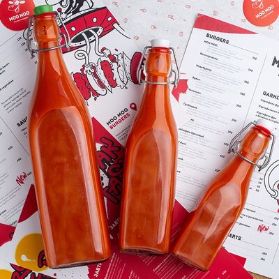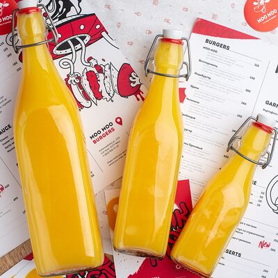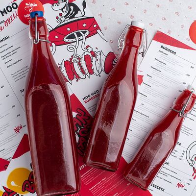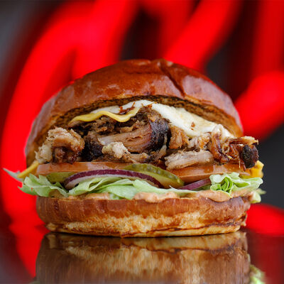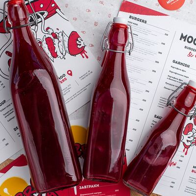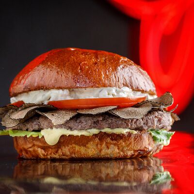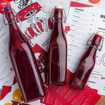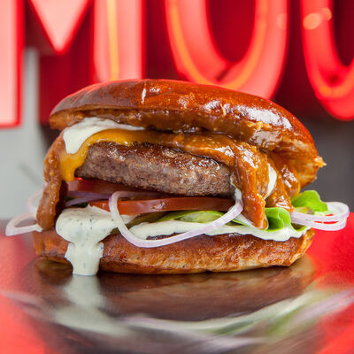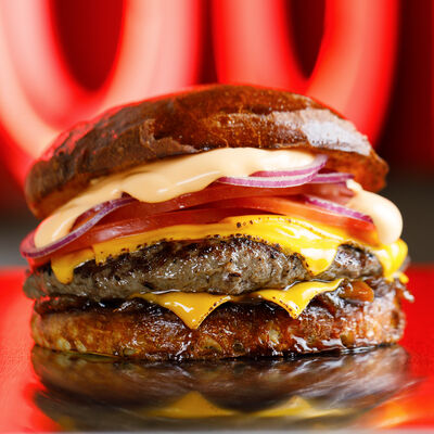Булочка, котлета из мраморной говядины, маринованные огурцы, красный лук, кетчуп и горчичный соус