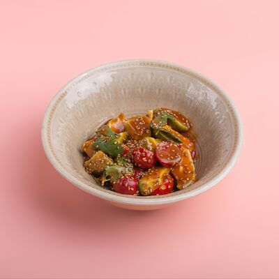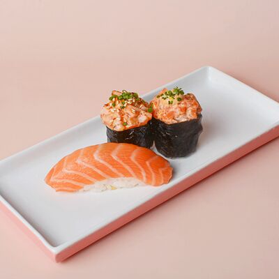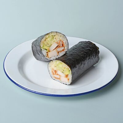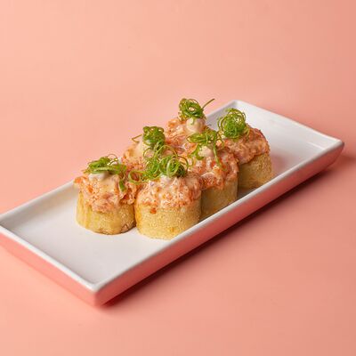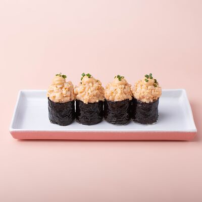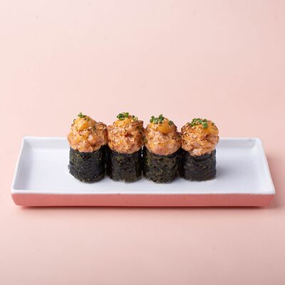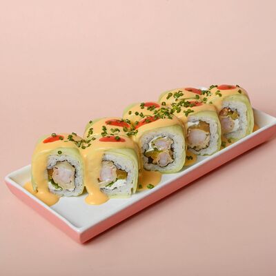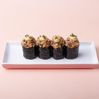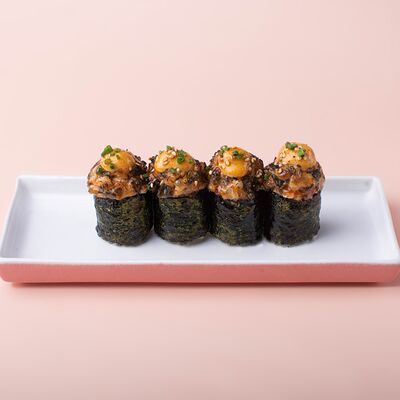Рис, сушидза (мицукан, мирин, сахар), угорь, нори, спайси соус (майонез, шрирача, чеснок, шичими, кунжутное масло, соевый соус), унаги соус, кунжут жареный, шнитт-лук (1 шт.)