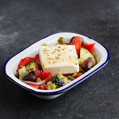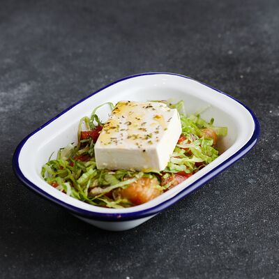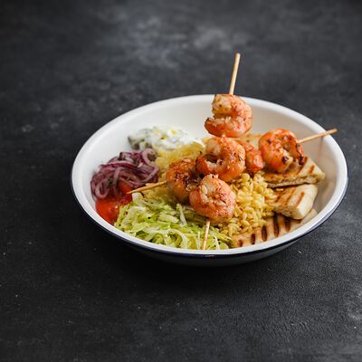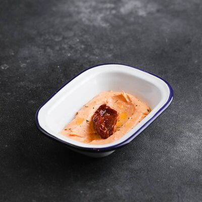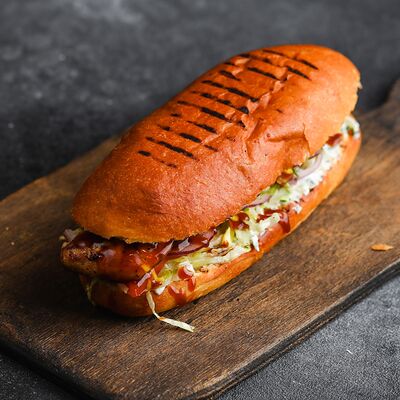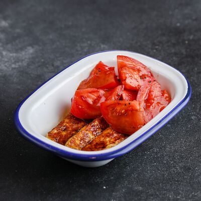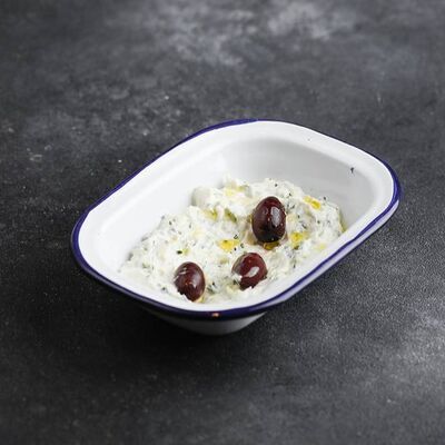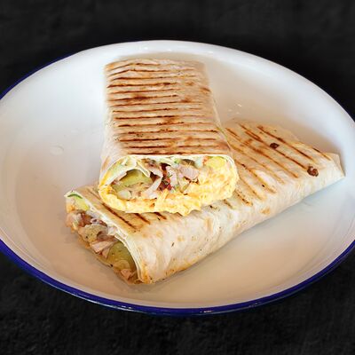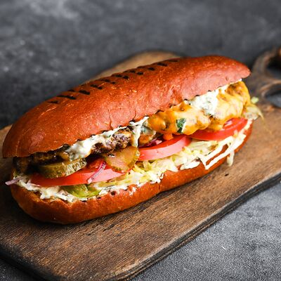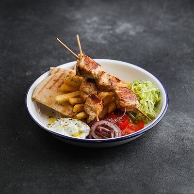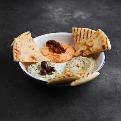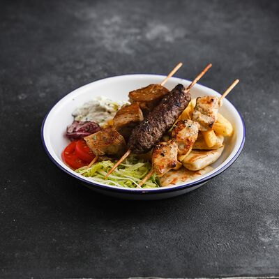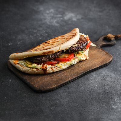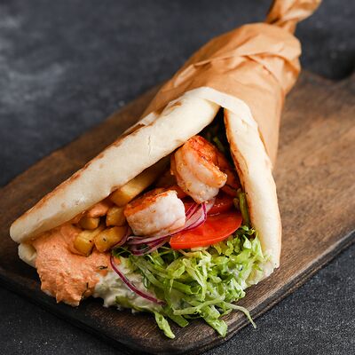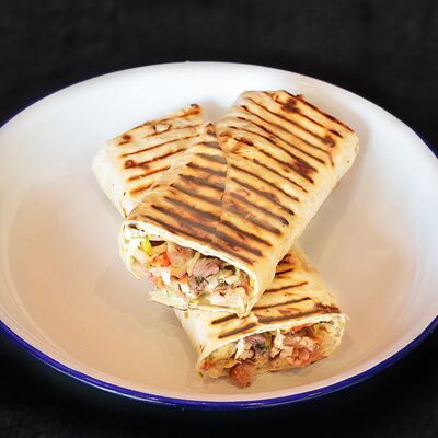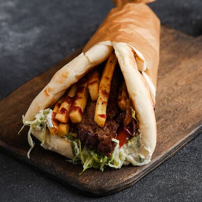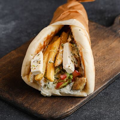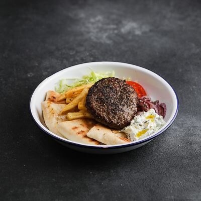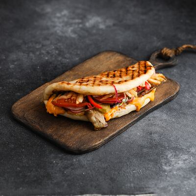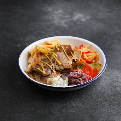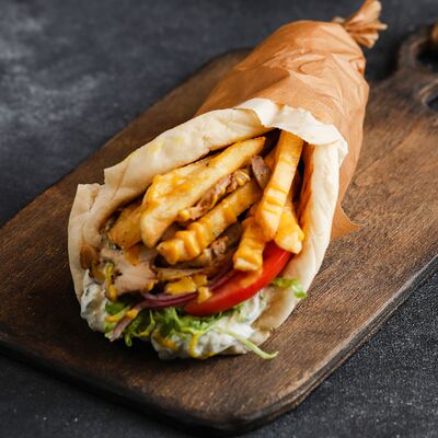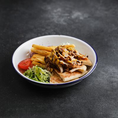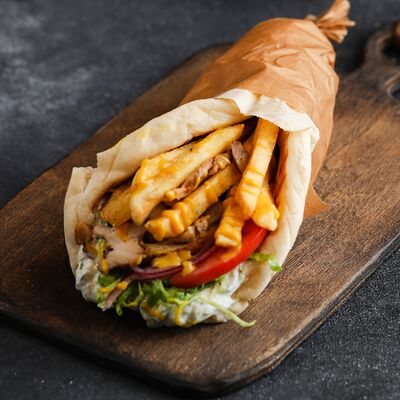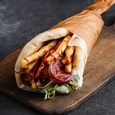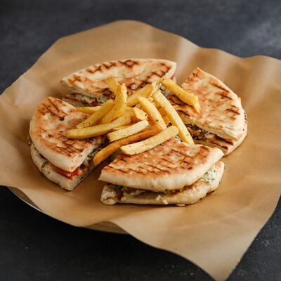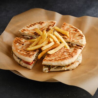 Клаб-сендвич с питами, свининой гриль, сыром чеддер, дзадзики, розовыми томатами, листьями салата айсберг, соусами BBQ и горчичным, орегано, картофелем фри