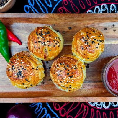 Слоеное тесто, мелко рубленная говядина, лук, специи