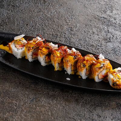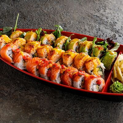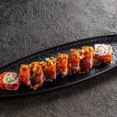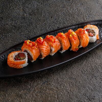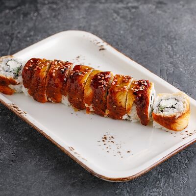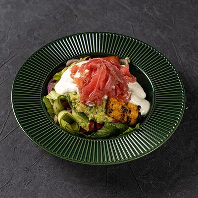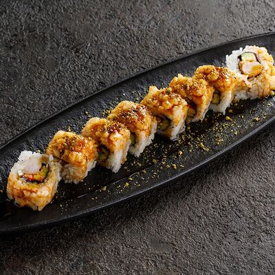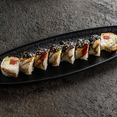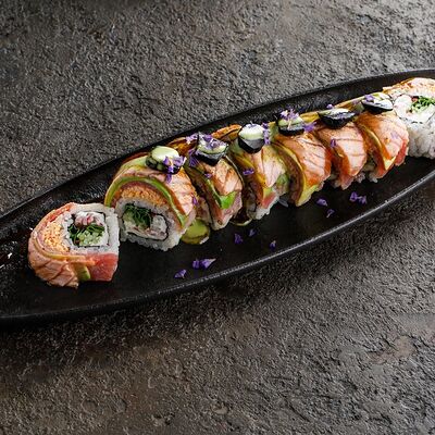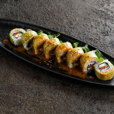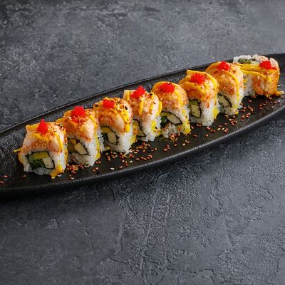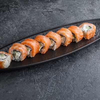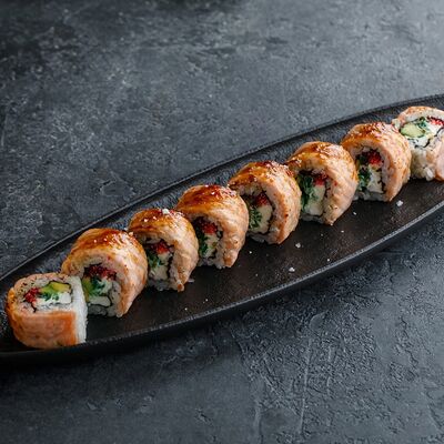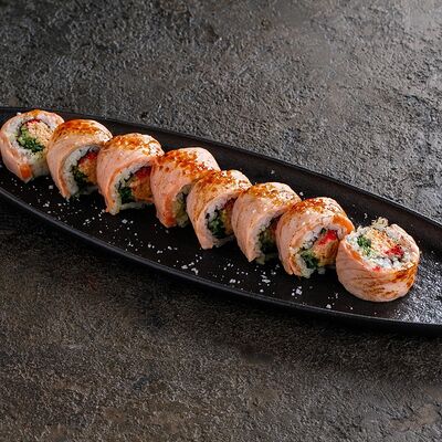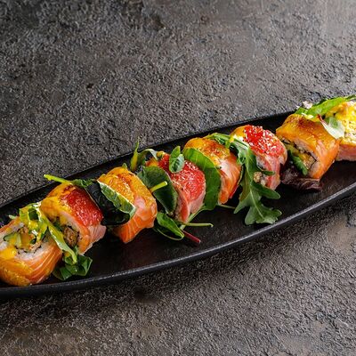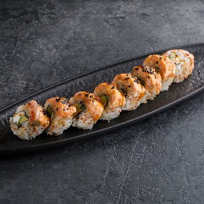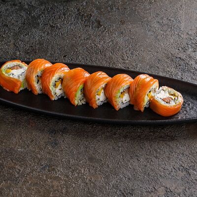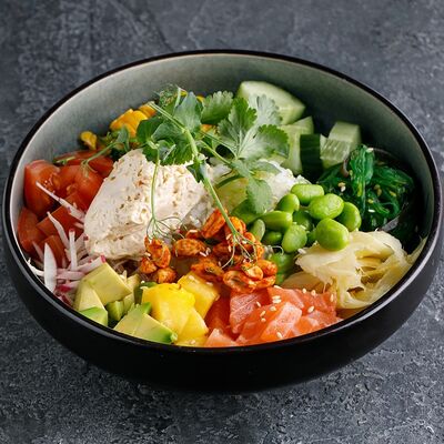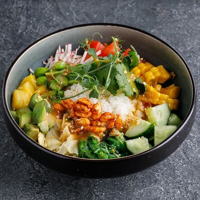 Основа рис, кукуруза вареная, авокадо, огурец, редис, томат, имбирь маринованный, чука, бобы, микс-салат, лосось, унаги крем, кинза, арахис, нори