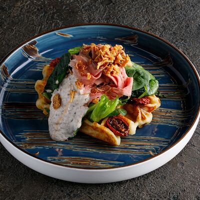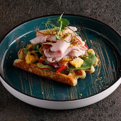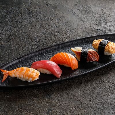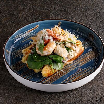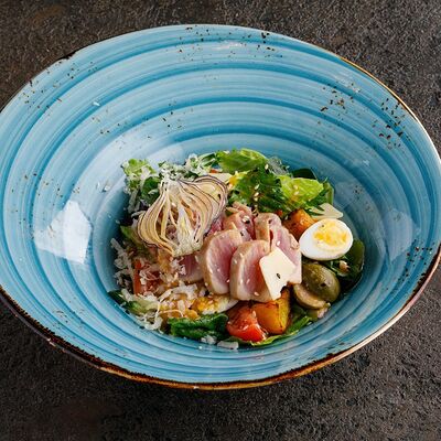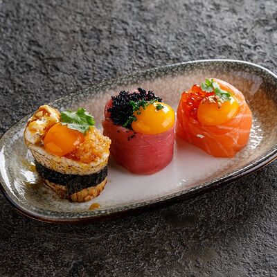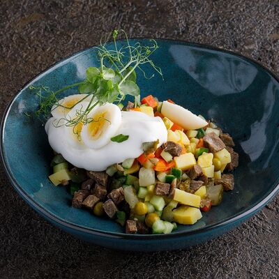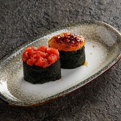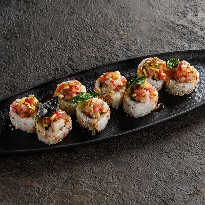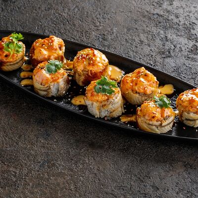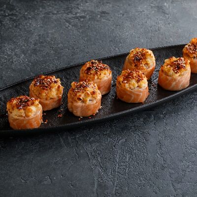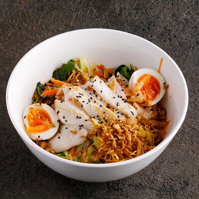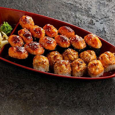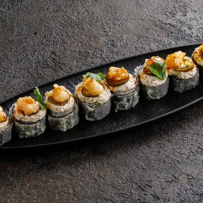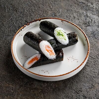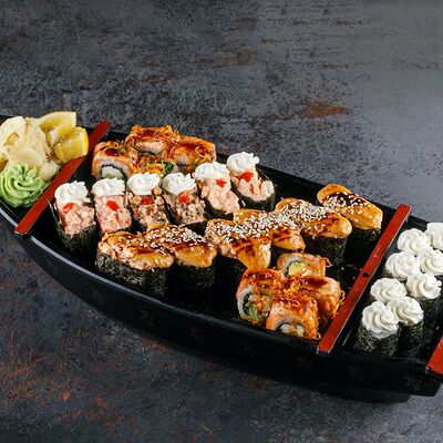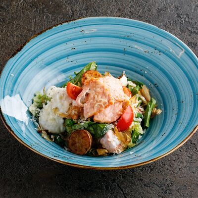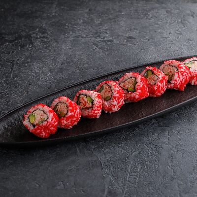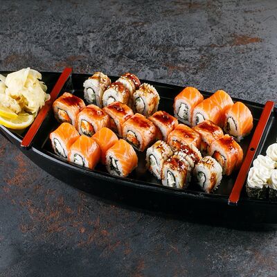 Основа рис, кукуруза вареная, авокадо, огурец, редис, томат, имбирь маринованный, чука, бобы, микс-салат, лосось, унаги крем, кинза, арахис, нори