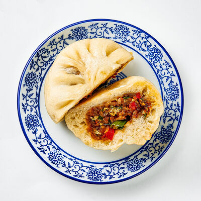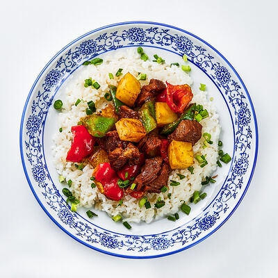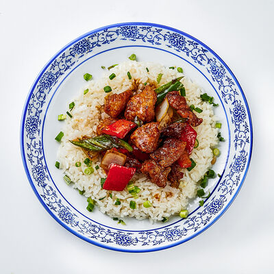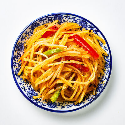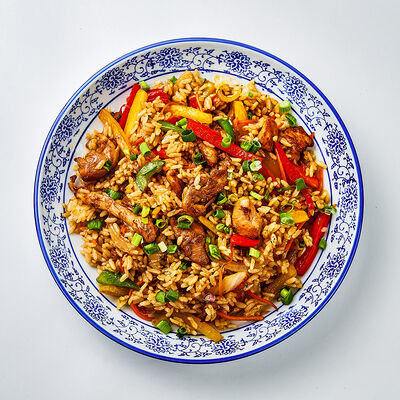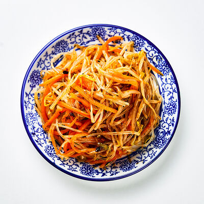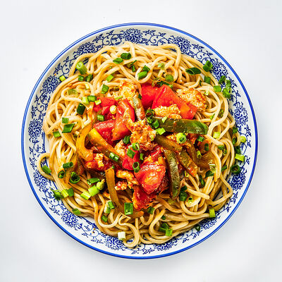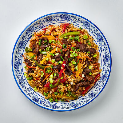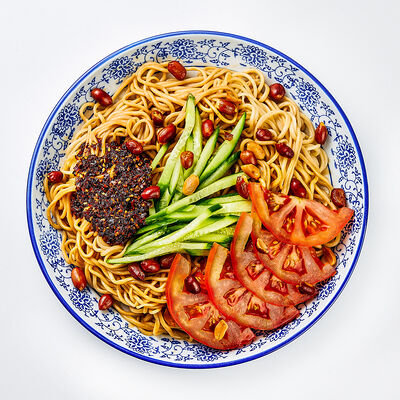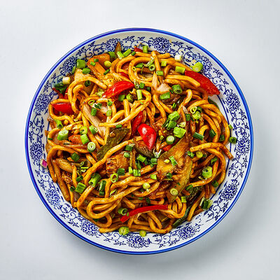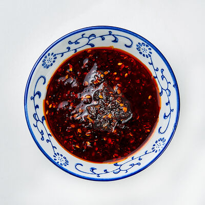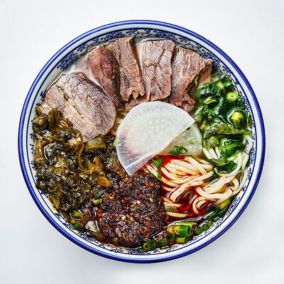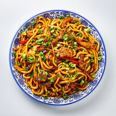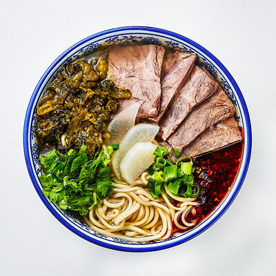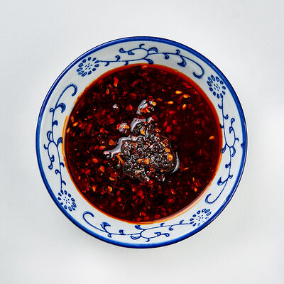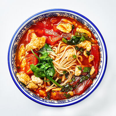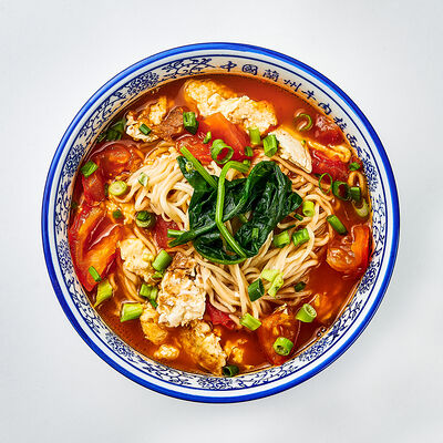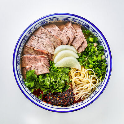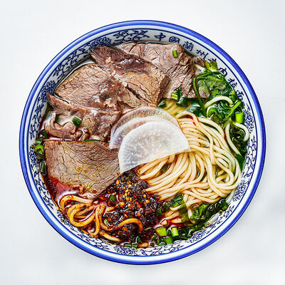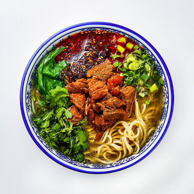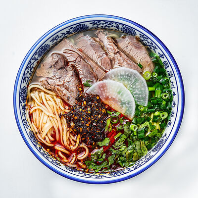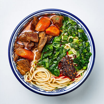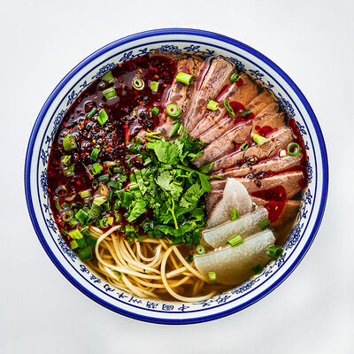 Рамен с широкой лапшой и огненным соусом из особого сорта перца чили. Осторожно, чрезвычайно остро! Говяжий бульон, пшеничная лапша, кусочки говядины, зеленый лук, кинза, чеснок, дайкон, соус из перца чили