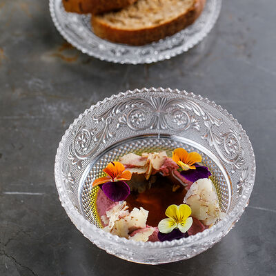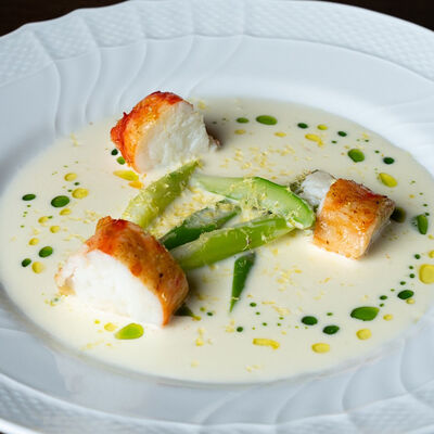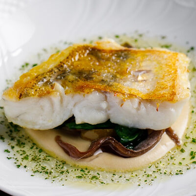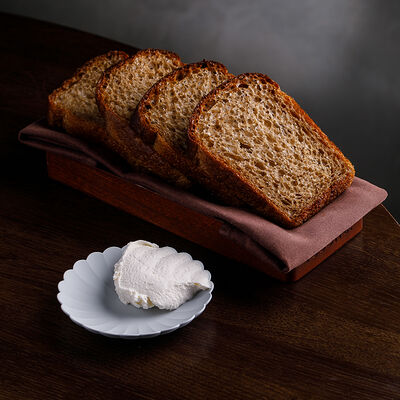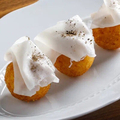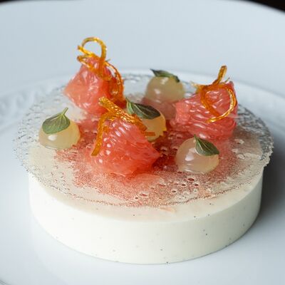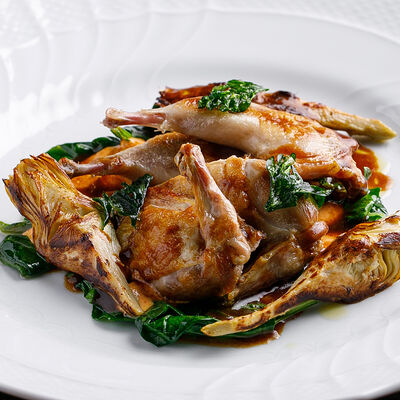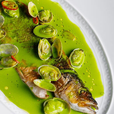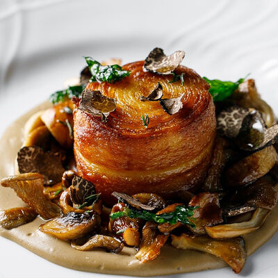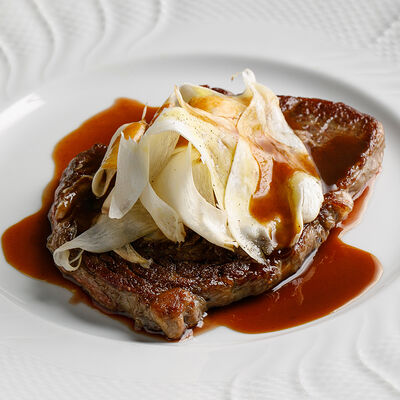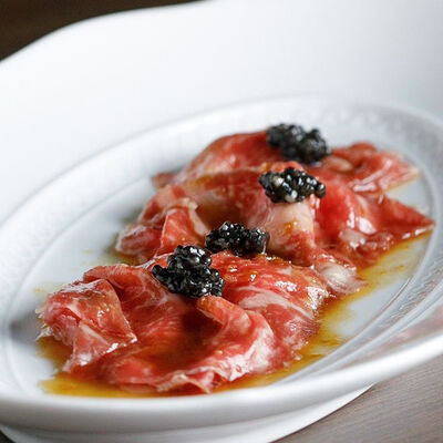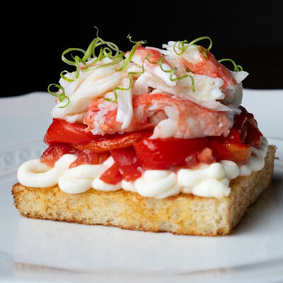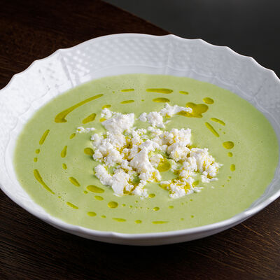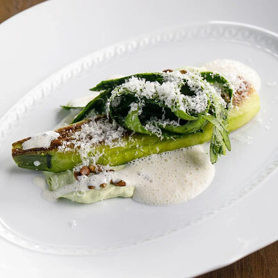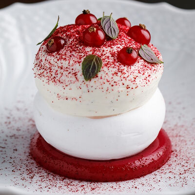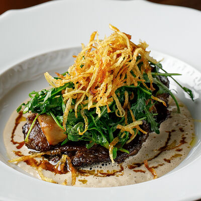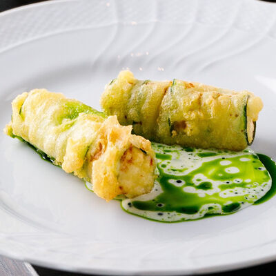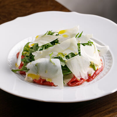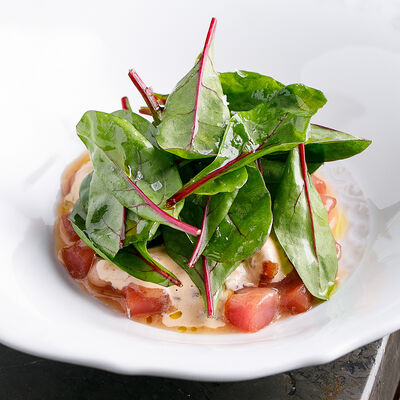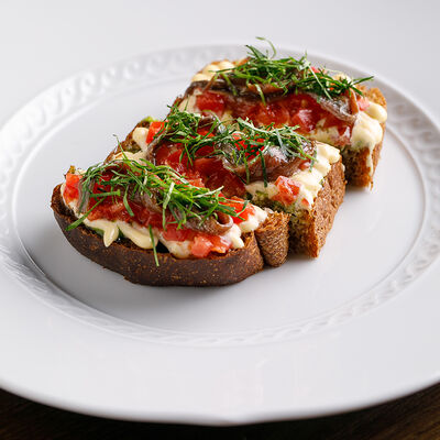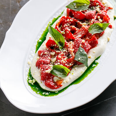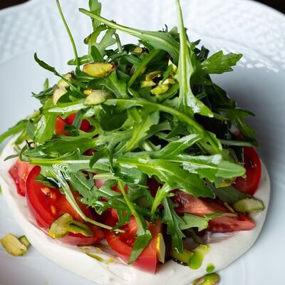 Томаты с кремом из горгонзолы и сливочного сыра, дополненные запеченными фисташками, руколой и маслом базилика