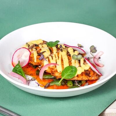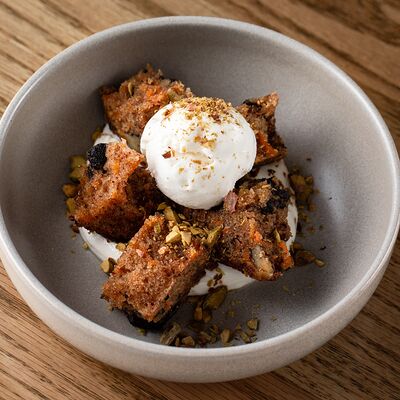 Морковь, грецкий орех, мука, сахар, имбирь молотый, корица молотая, сода, яйцо, ванилин, растительное масло, фисташки, крем из сметаны, джелато
