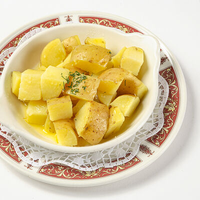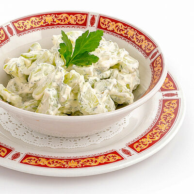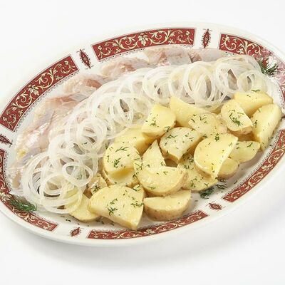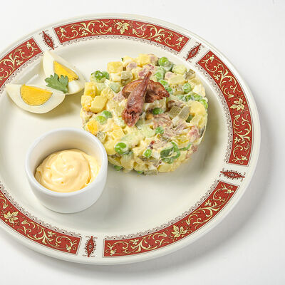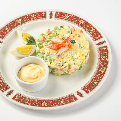 Картофель, яйцо куриное, огурец свежий, мясо камчатского краба, майонез. Картофель и яйцо куриное отваривается. Все ингредиенты нарезаются кубиками. Нарезанные овощи, мясо камчатского краба и яйцо куриное смешиваются с зелёным горошком. Салат заправляется майонезом, украшается нарезанным мясом краба, двумя дольками яйца и петрушкой