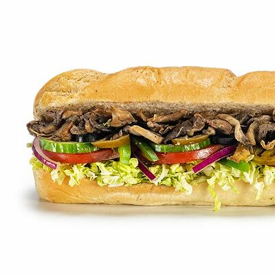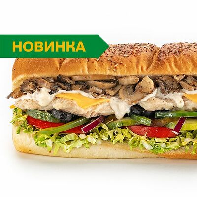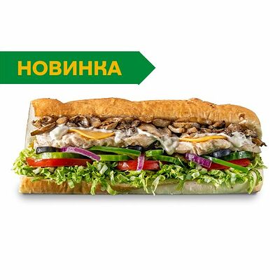 Ароматные обжаренные шампиньоны с сочными листьями салата, свежими и маринованными огурцами, ароматными помидорами, сладким перцем в свежевыпеченном хлебе в комбинации с вашим любимым соусом