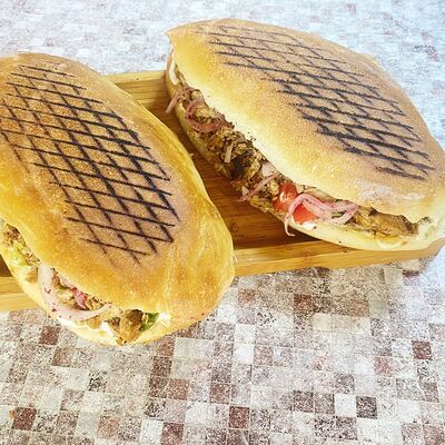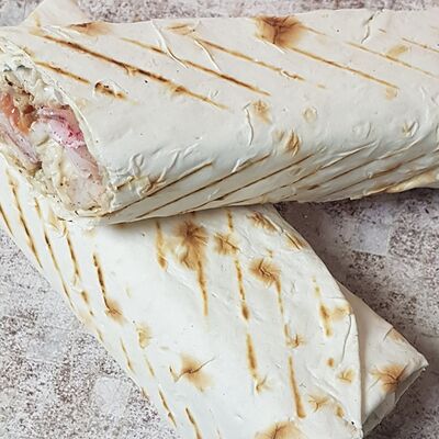 Сырный лаваш, курица на мангале, сырный соус, чесночный соус, помидоры, огурцы, пекинская капуста, красный лук, маринованные огурцы