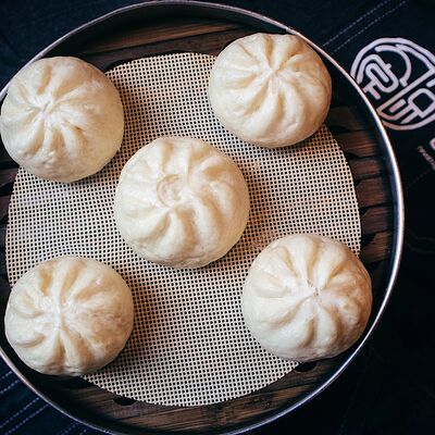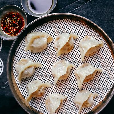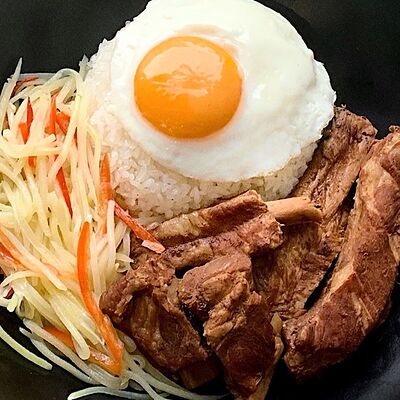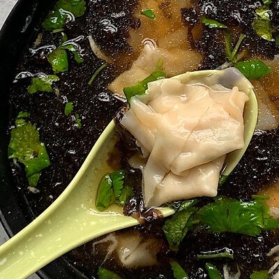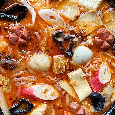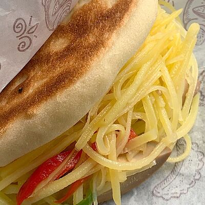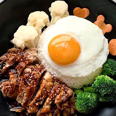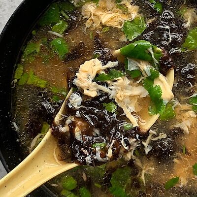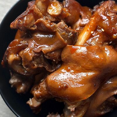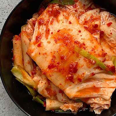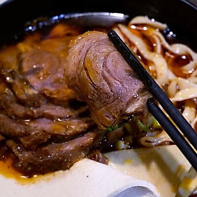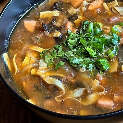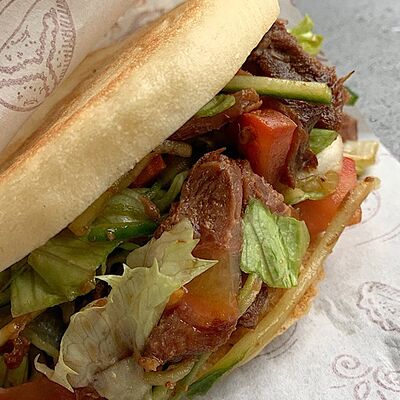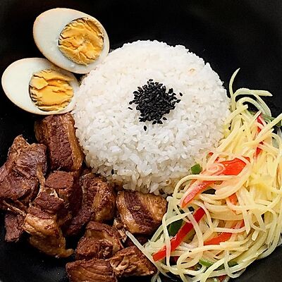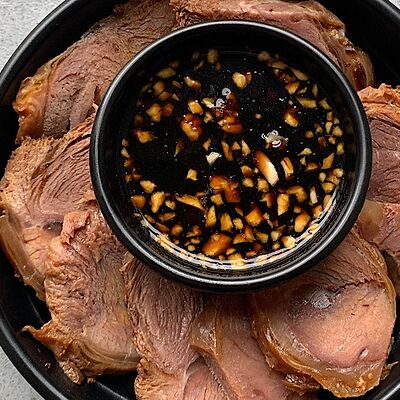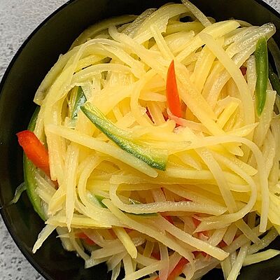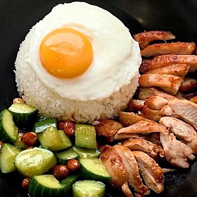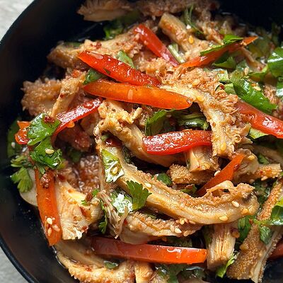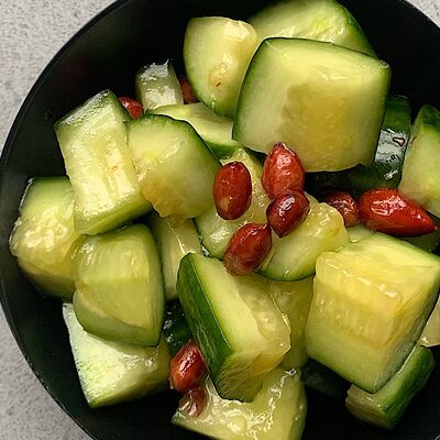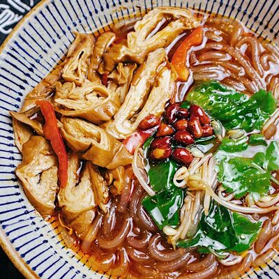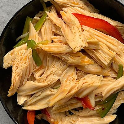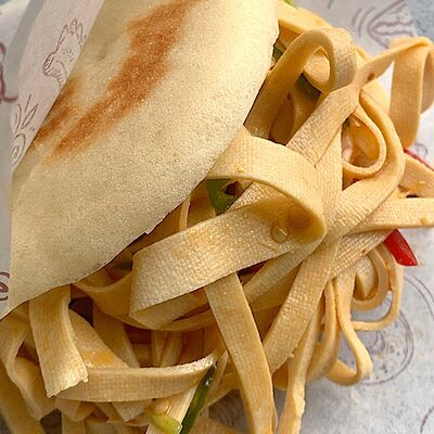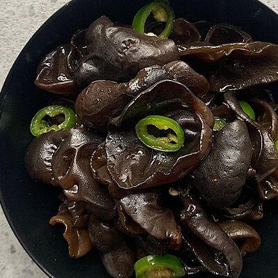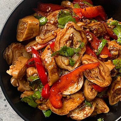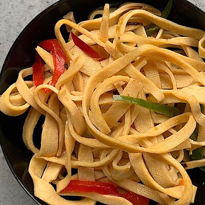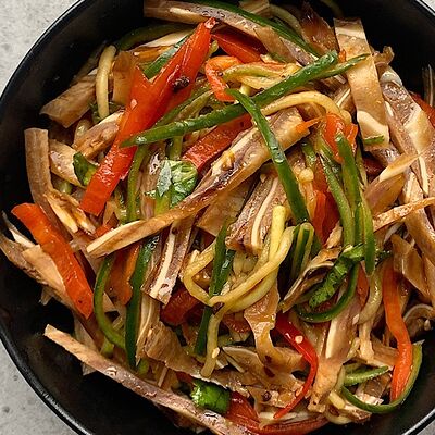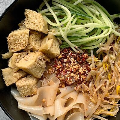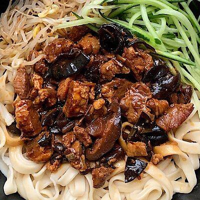 Пшеничная лапша, свинина в бобовом соусе с грибами, огурец, ростки маша