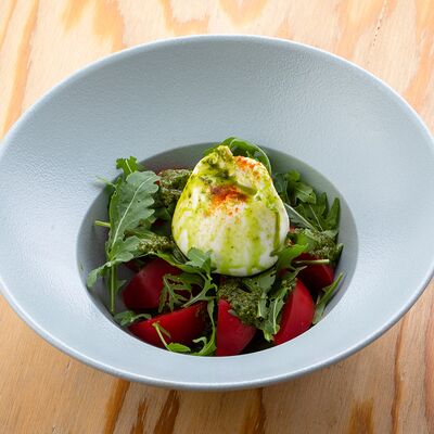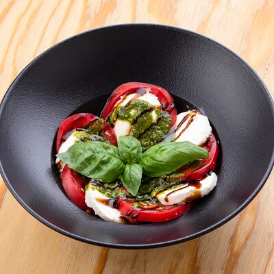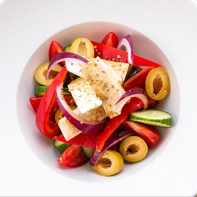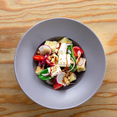 Баклажаны, томаты, лук красный, сербская брынза, редис, шпинат, бальзамический соус, орех грецкий, орегано