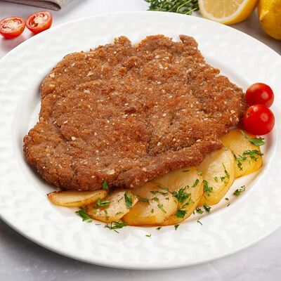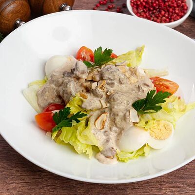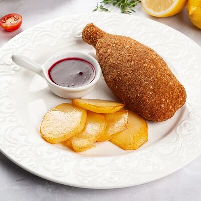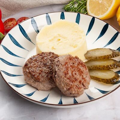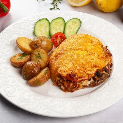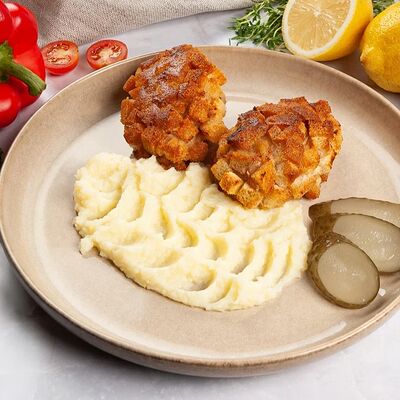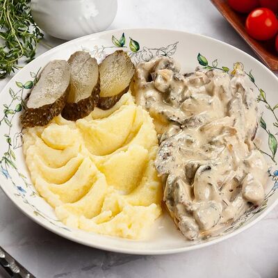Куриная грудка-куриное бедро, лук, сливки, яйца, хлеб, сухари, картофельное пюре, зелень, огурцы соленные, соус грибной