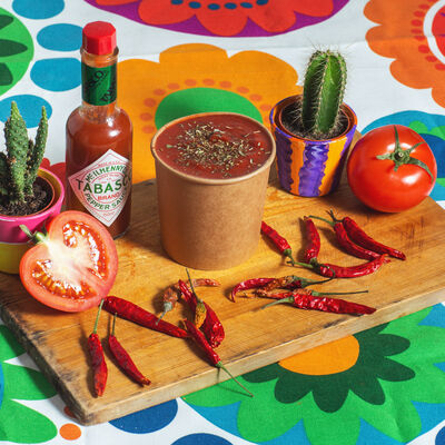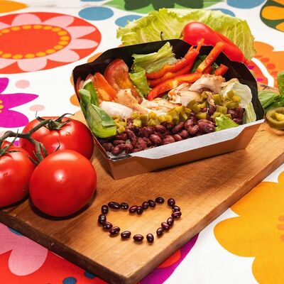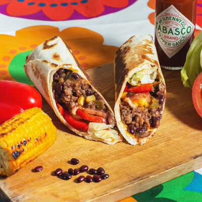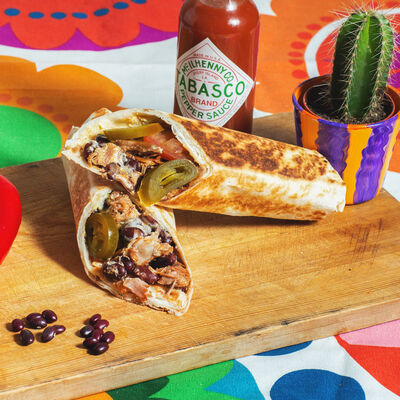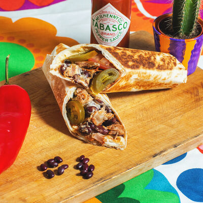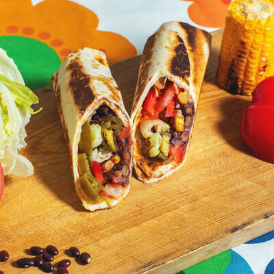 Пшеничная тортилья, соус сливочный, соус острый, красная фасоль, бедро цыплёнка, помидоры, много халапеньо