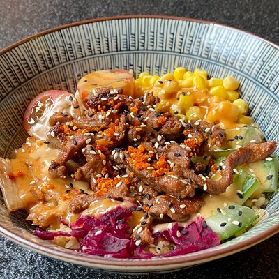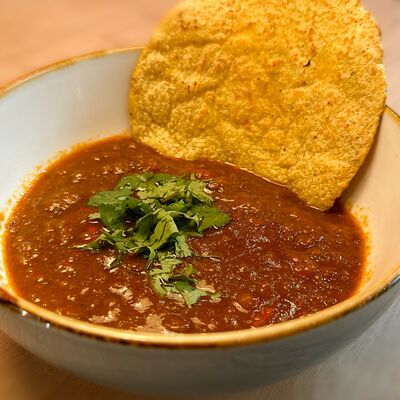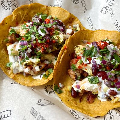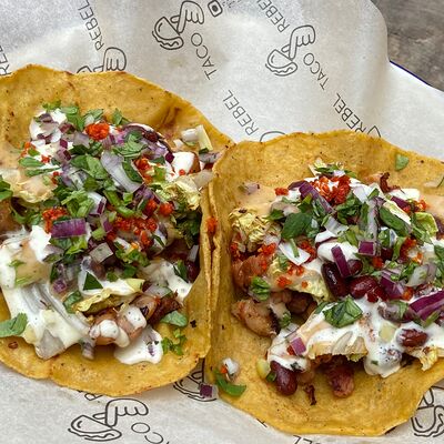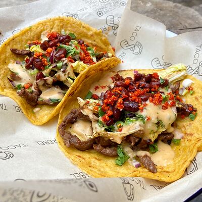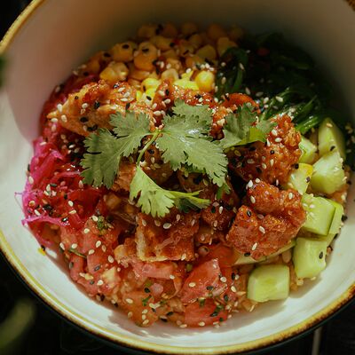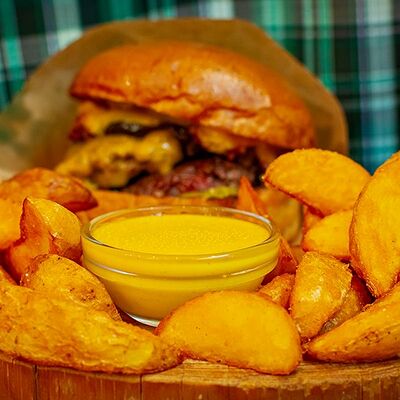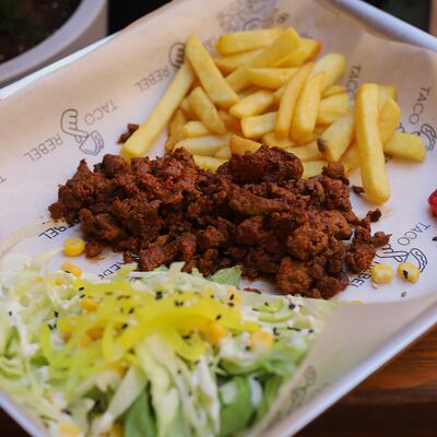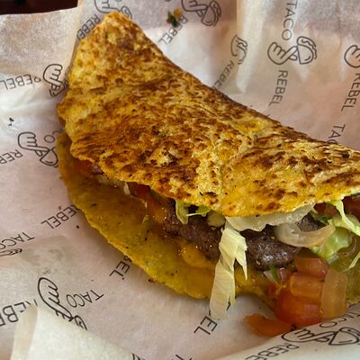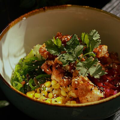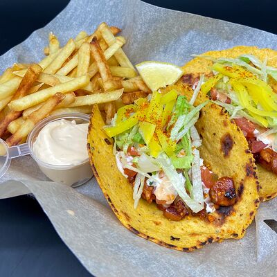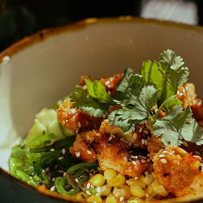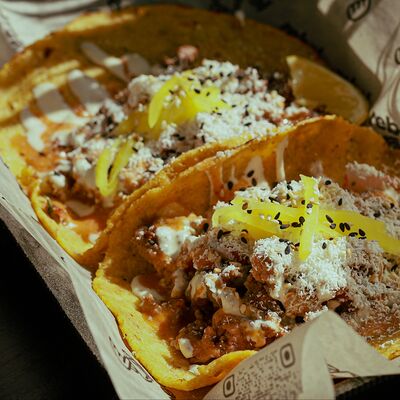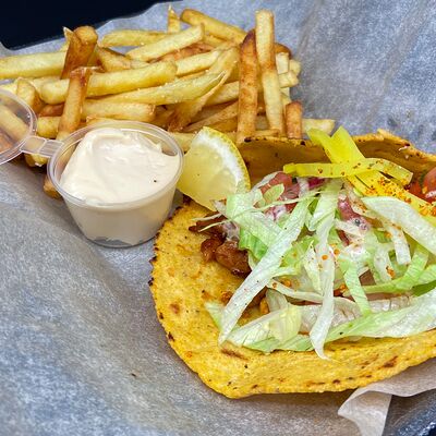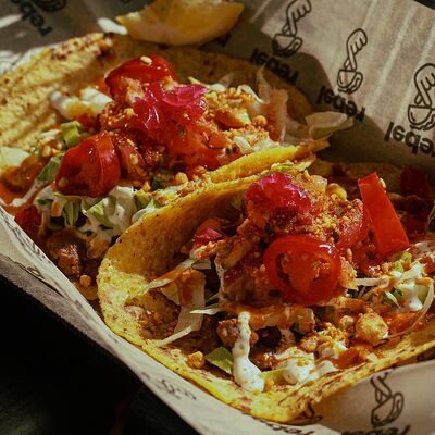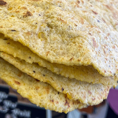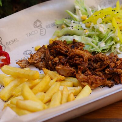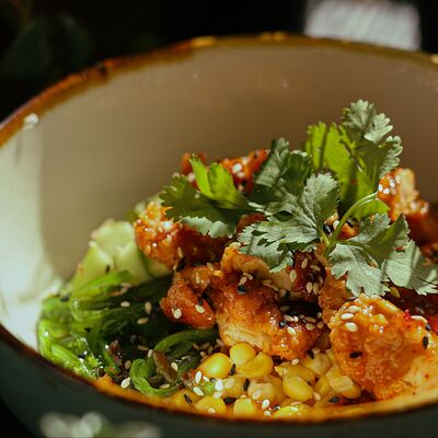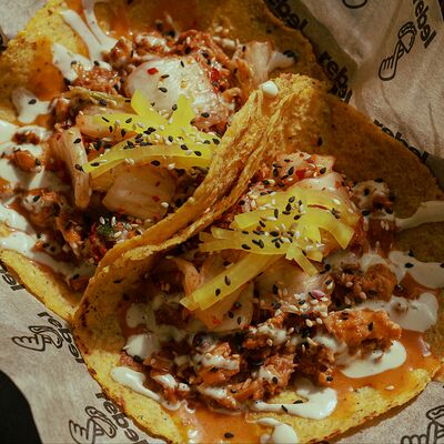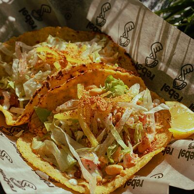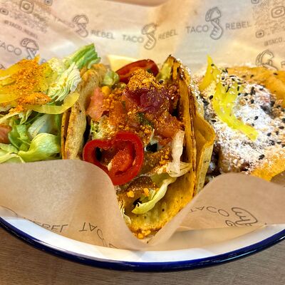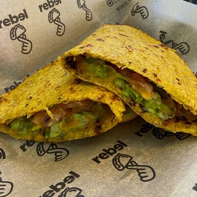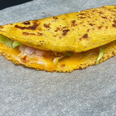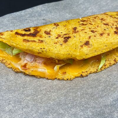 Кукурузное тесто, сыр чеддер, салат, томатная сальса, соус креветка, соус бенг-бенг