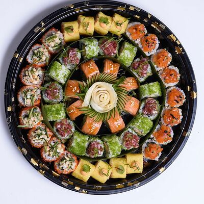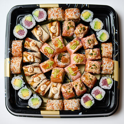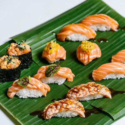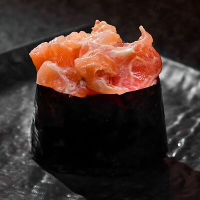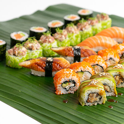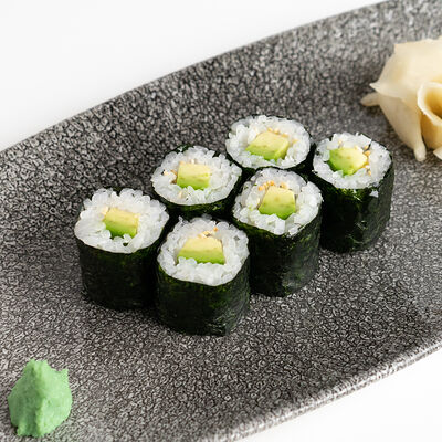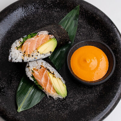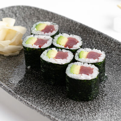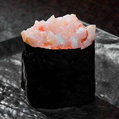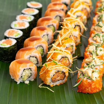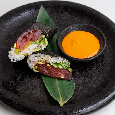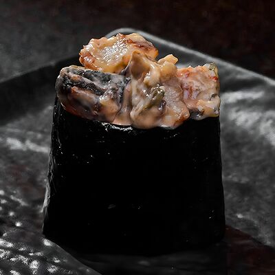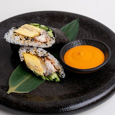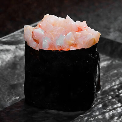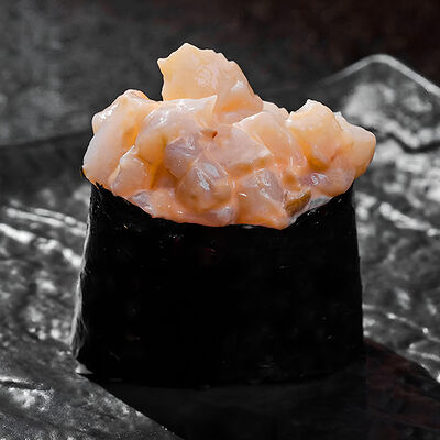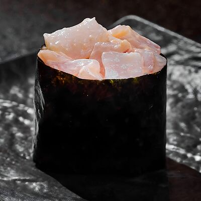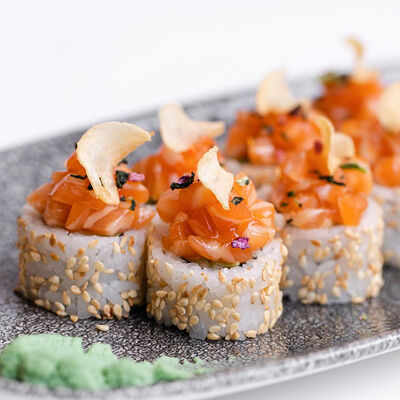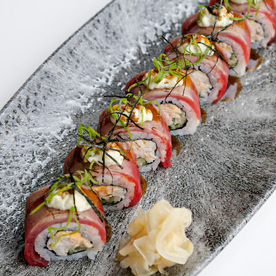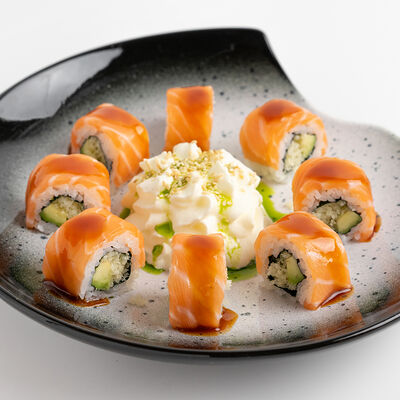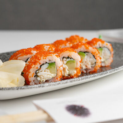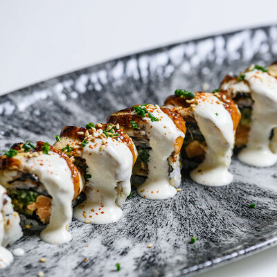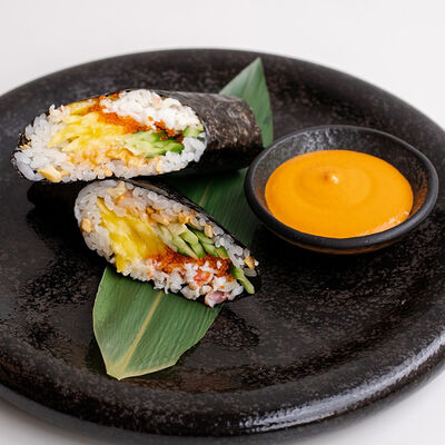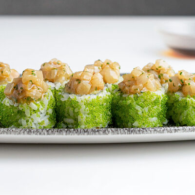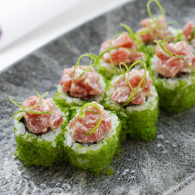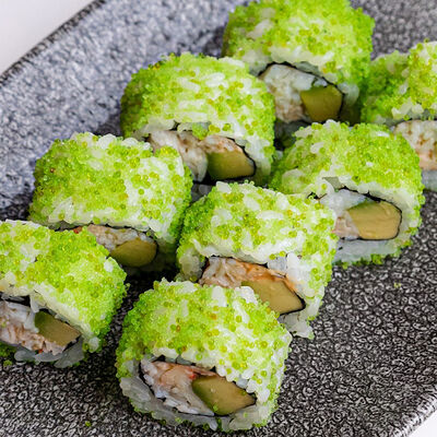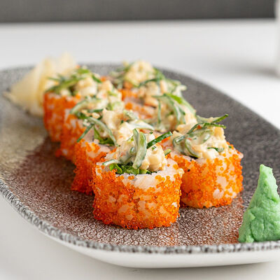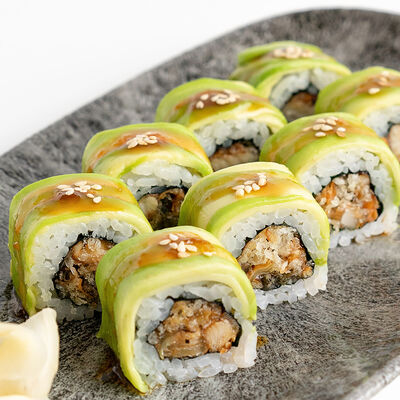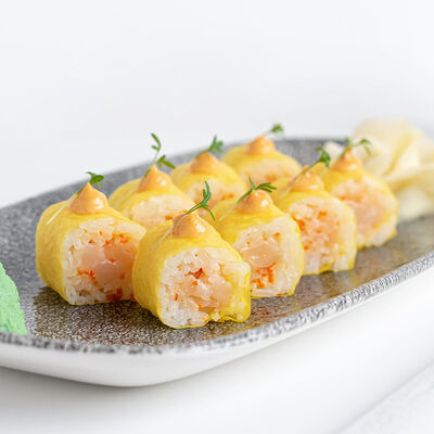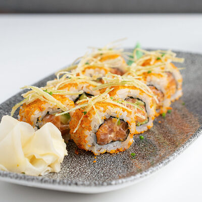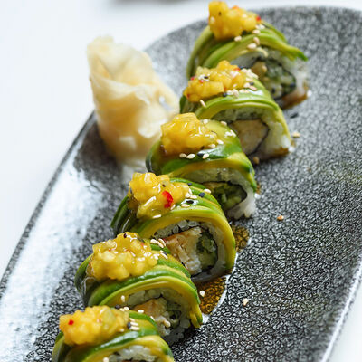 Морской окунь, рис, нори, темпура, манго, соус халапеньо, тобико, зеленый лук (8 шт.)