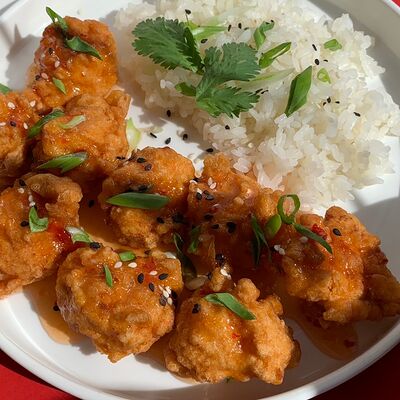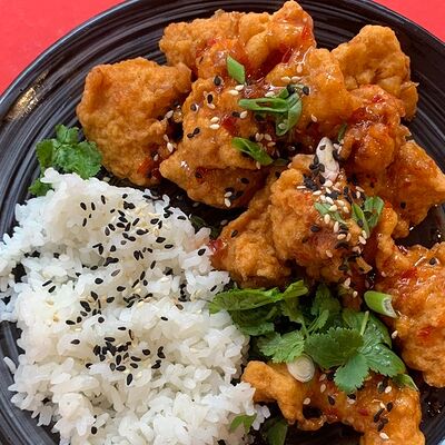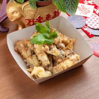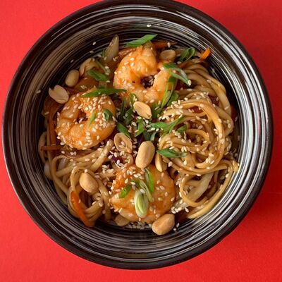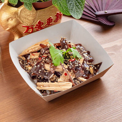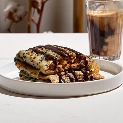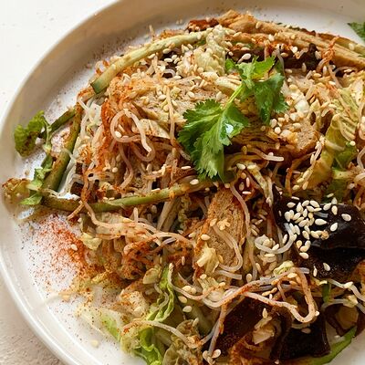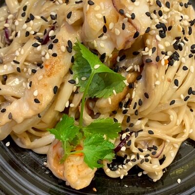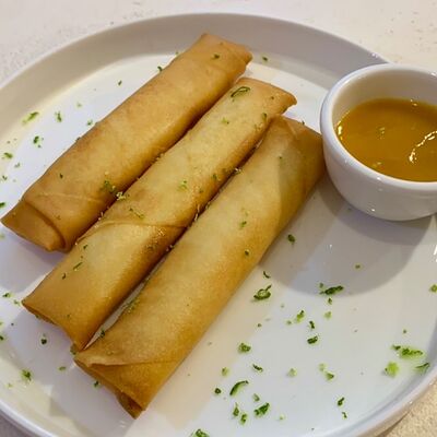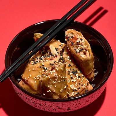 Тесто из бобовой и пшеничной муки, куриное яйцо, кунжут, зелень (кинза, лук), соус хойсин, соус с хрустящим чили перцем, хрустящее тесто, шампиньоны, древесные грибы, лук, морковь, чеснок