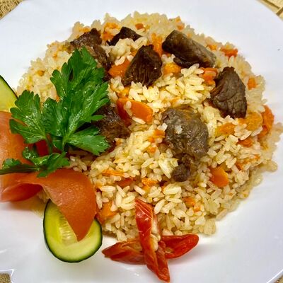 Традиционный узбекский плов из говяжьей мякоти с рисом лазер, жёлтой и красной морковью, ароматным чесноком и с добавлением зиры