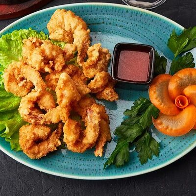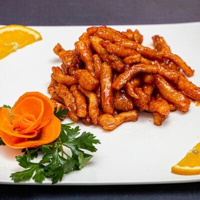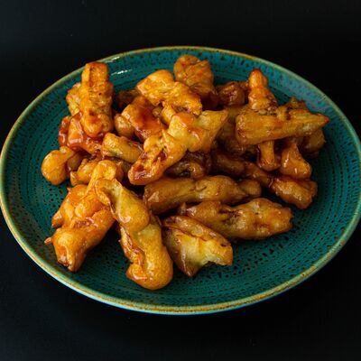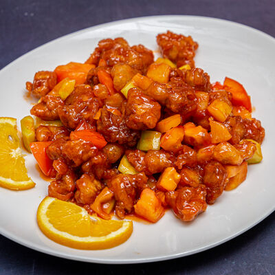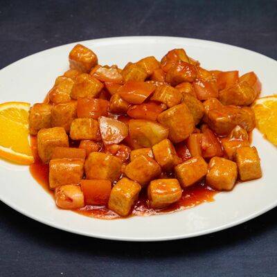 Тофу, крахмал, томаты, кисло-сладкий соус, подсолнечное масло