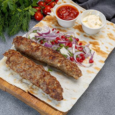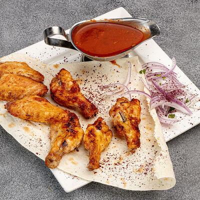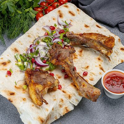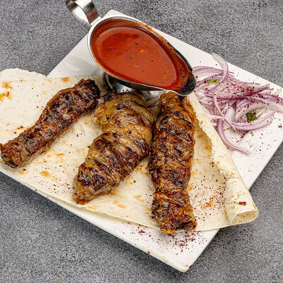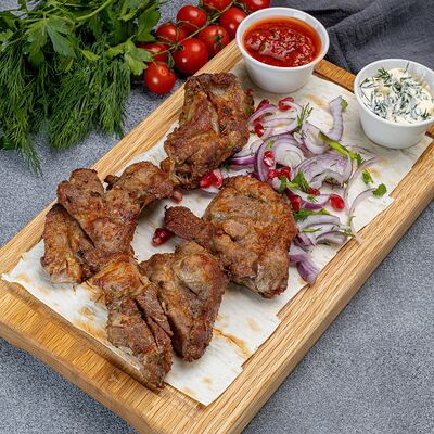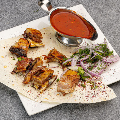 Куриное филе, маринад, отдельно подаётся красный лук и соус аджика