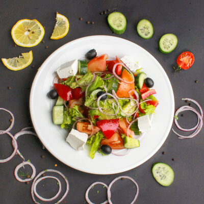 Ассорти листового салата, помидоры, огурцы, сыр, телятина. Заправляется домашним майонезом