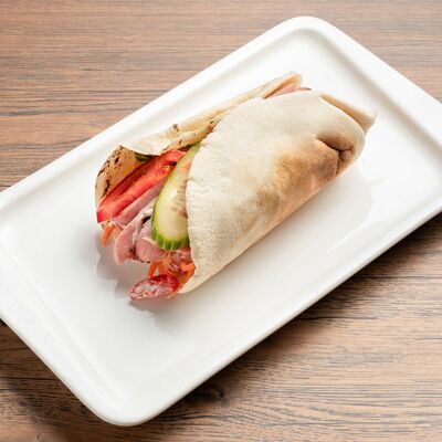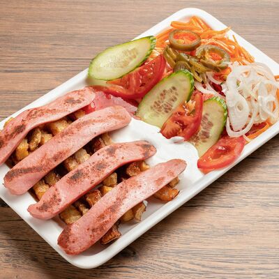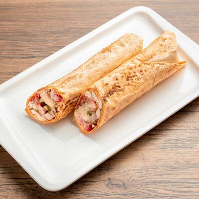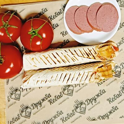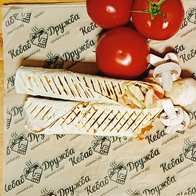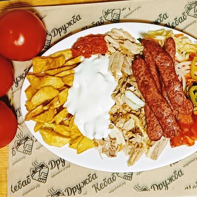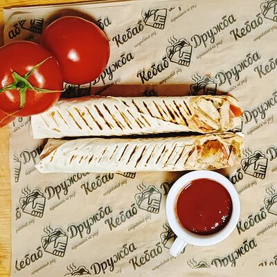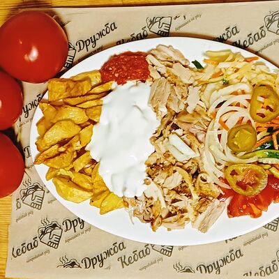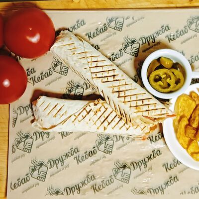 Курица, свежий огурец, помидоры, пекинская капуста, лук, фирменный соус, лаваш, соус барбекю, перец халапеньо, картофель жареный
