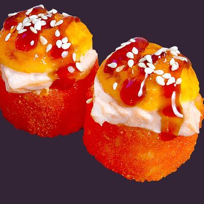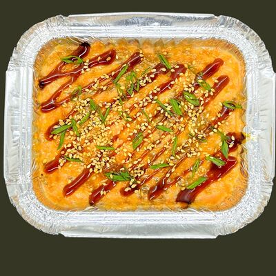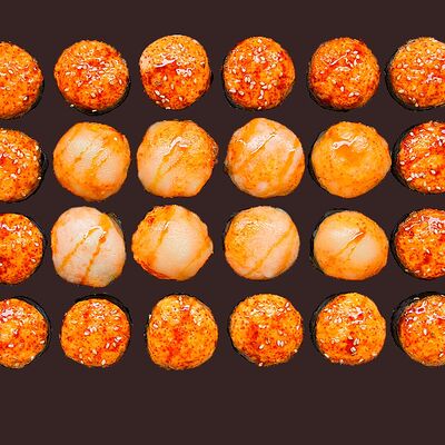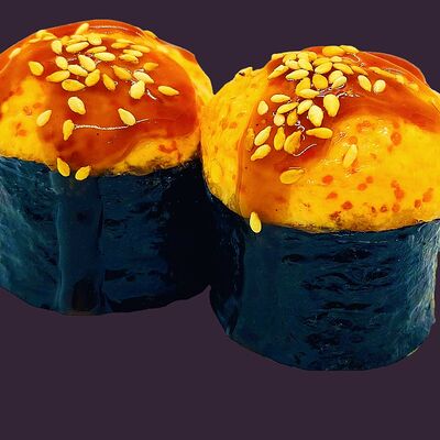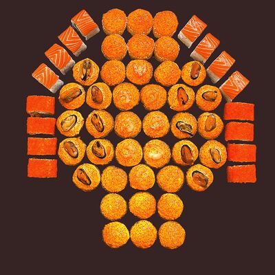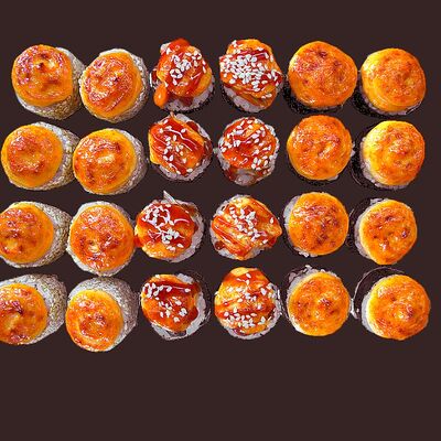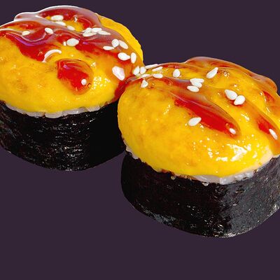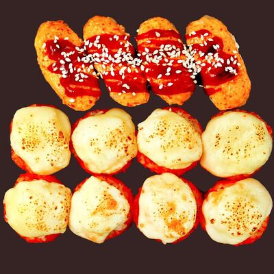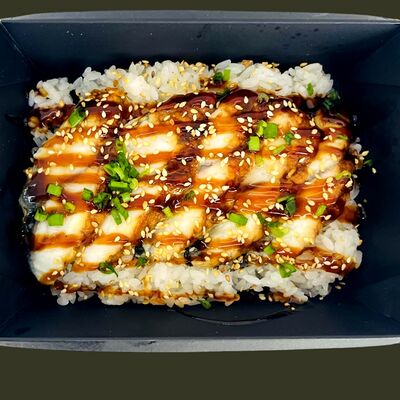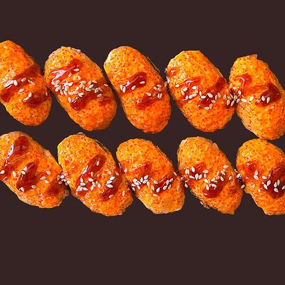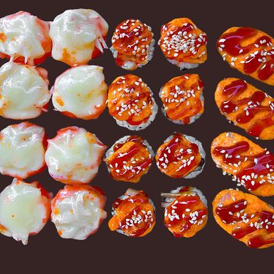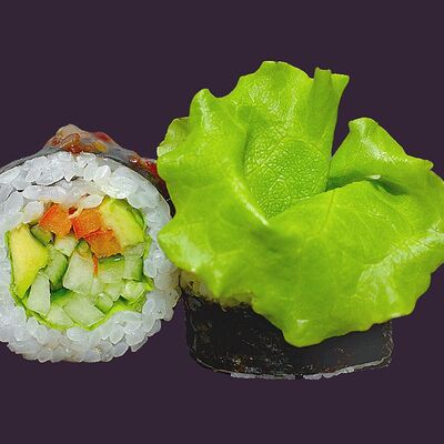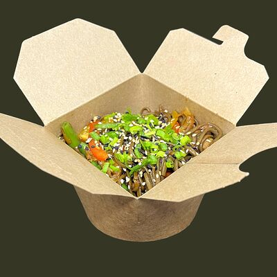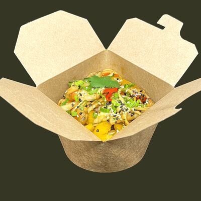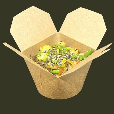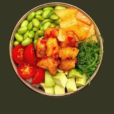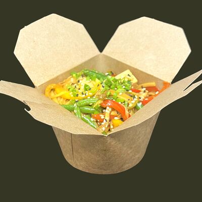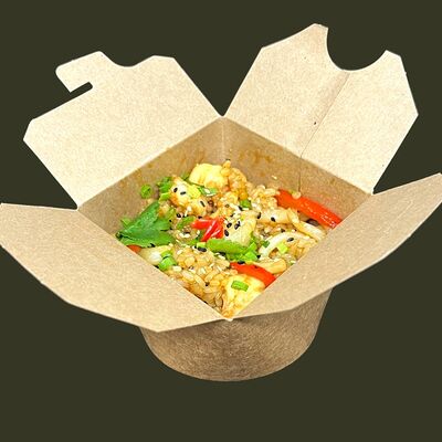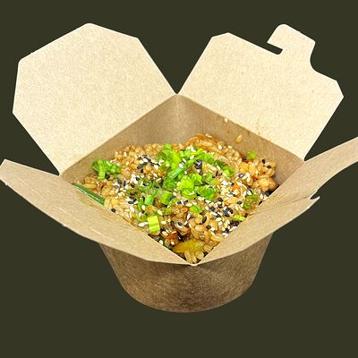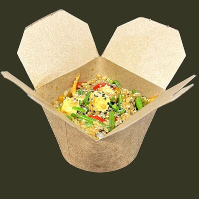 Рис, соевый сыр тофу, перец болгарский (жёлтый, красный), грибы вешенки, фасоль, морковь, лук, имбирь, чеснок, кунжут, соус кисло-сладкий, фирменный соус терияки